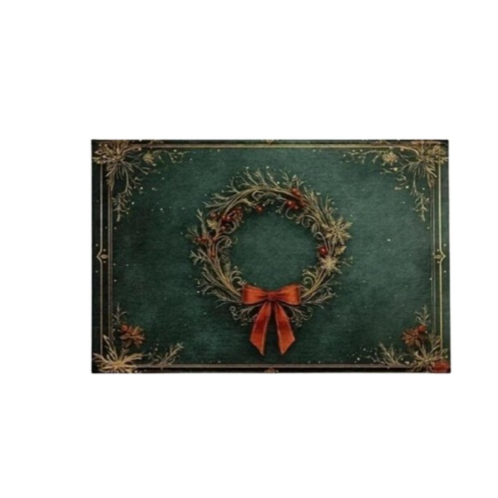 Weihnachtsdesign: Vintage-Weihnachtsfußmatte mit dunkelgrünem Hintergrund, in der Mitte ein goldener Weihnachtskranz mit roter Schleife, umgeben von goldfarbenen Pflanzenmustern. Sie strahlt weihnachtliche Stimmung und künstlerischen Charme aus und sorgt für fröhliche und festliche Atmosphäre für Ihre Weihnachtsdekoration sowie für Ihre Gäste.