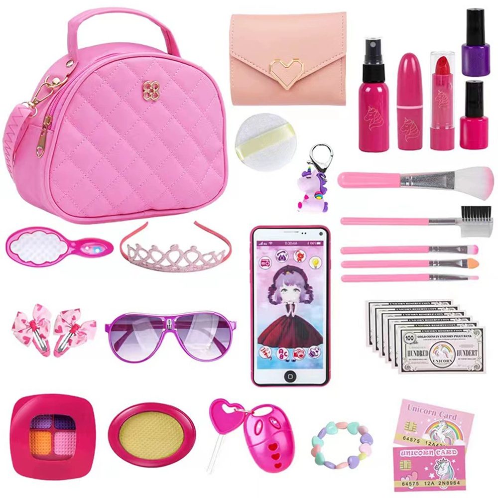 Mädchen Rollenspiel Spielzeug Set mit einer niedlichen Handtasche und Zubehör, speziell entwickelt, um die Fantasie der Kinder anzuregen. Ihre Tochter kann sich als Prinzessin verkleiden und Mama nachahmen – von der modischen Handtasche bis hin zu realistisch aussehenden Kosmetika, alles ist dabei, damit Ihr Kind stundenlangen kreativen Spaß hat, ohne sich Sorgen über den Kontakt mit echten Kosmetika machen zu müssen.
