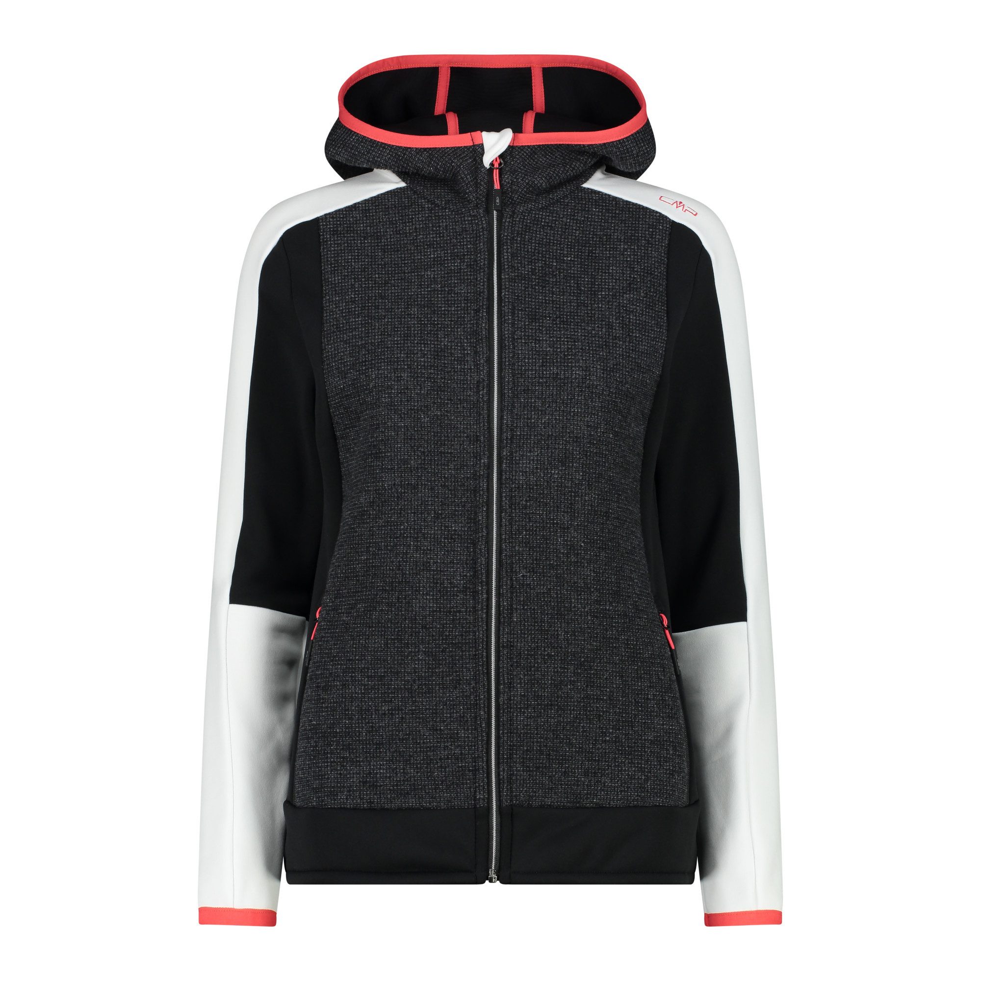 CMP Damen Jacke Woman Jacket Fix Hood. Diese Jacke kombiniert zwei unterschiedliche Materialien, die eine perfekte Verbindung aus Schutz und Tragekomfort bieten. Auf der Vorderseite mit Wooltech, einem Wollmischgarn, das optimale Wärmeisolierung und Atmungsaktivität garantiert. Ärmel, Seiten und Kapuze sind aus Stretch-Performance-Fleece, das maximale Elastizität gewährleistet und echten Outdoor-Stil repräsentiert. Mit Reißverschluss vorne mit Windfangeinsatz und Scheuerschutz und zwei großen Seitentaschen. In unseren Werken hergestellt. Material: 38% Viskose, 25% Wolle, 16% Polyacryl, 8% Polyester, 7% Polyamid, 4% Sonstiges Fasern, 2% Elasthan.