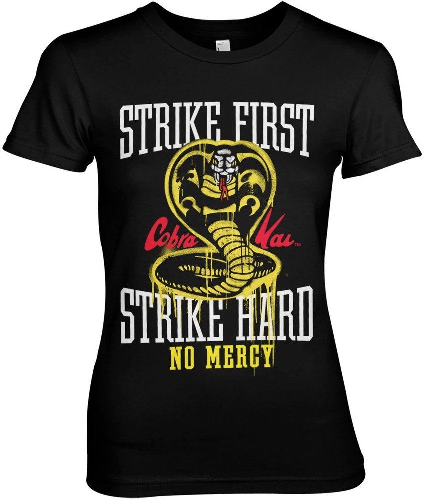 Das Cobra Kai Strike First Strike Hard No Mercy Girly Tee Damen T-Shirt in Schwarz ist ein Must-Have für alle Fans der beliebten Serie. Das coole Design mit dem markanten Schriftzug und dem ikonischen Cobra Kai Logo auf der Vorderseite macht dieses Shirt zu einem echten Hingucker. Der feminine Schnitt sorgt für eine perfekte Passform und macht das T-Shirt zu einem bequemen Begleiter für den Alltag. Hergestellt aus hochwertiger Baumwolle ist das Cobra Kai Damen T-Shirt nicht nur stylisch, sondern auch angenehm zu tragen. Die gute Verarbeitung und die hochwertigen Materialien garantieren eine lange Lebensdauer des Shirts. Egal ob beim Sport, in der Freizeit oder beim Treffen mit Freunden - mit diesem T-Shirt setzt du ein Statement und zeigst deine Liebe für Cobra Kai. Hol dir jetzt das Cobra Kai Strike First Strike Hard No Mercy Girly Tee Damen T-Shirt in Schwarz und zeige allen, dass du ein echter Fan bist. Das perfekte Geschenk für dich selbst oder für einen anderen Cobra Kai Liebhaber. Bestelle jetzt und sei bereit, dich in die Welt von Cobra Kai zu stürzen!