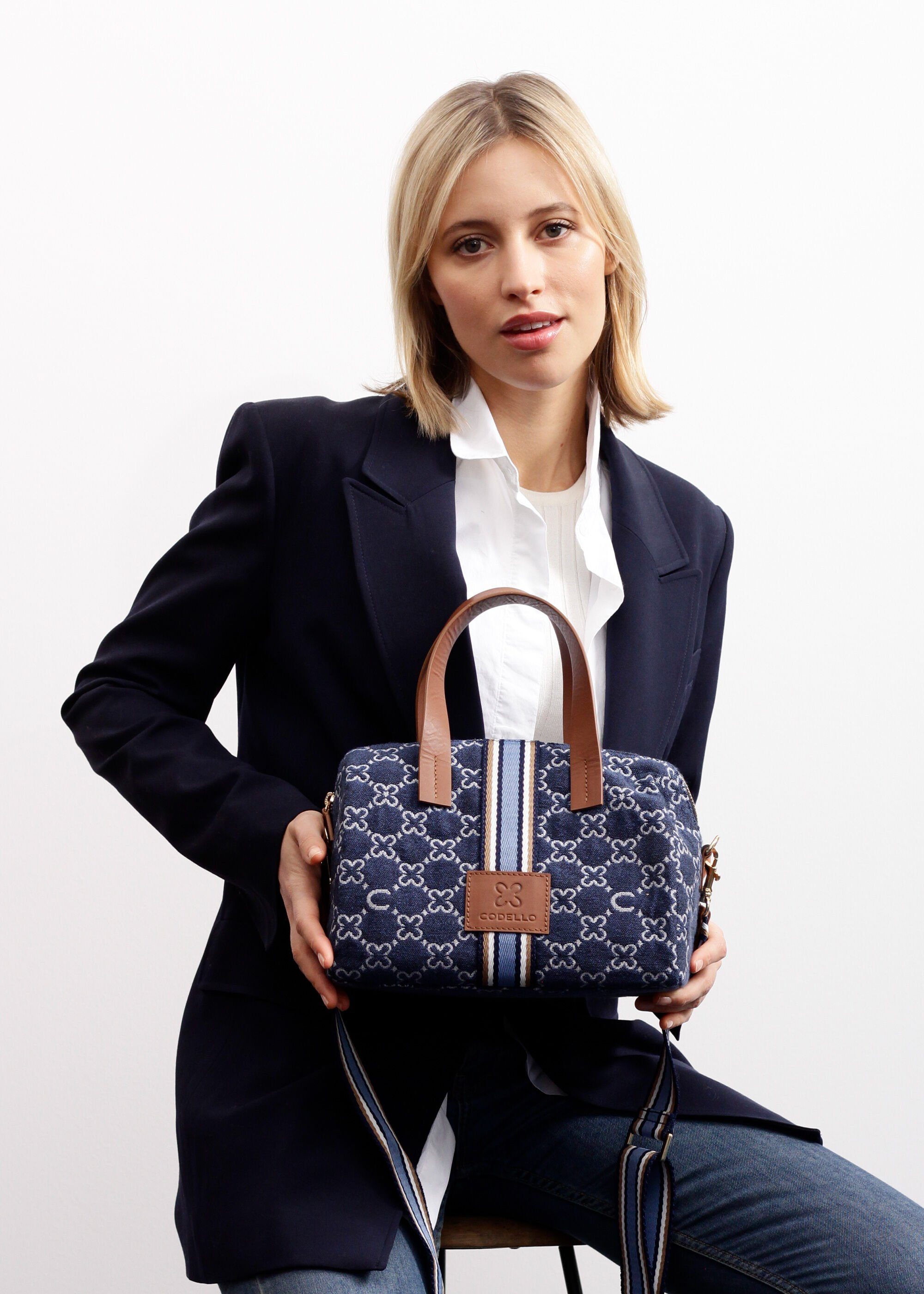 Du stehst auf ausgefallenes, exklusives Taschen-Design? Dann solltest du in diese stylische Bowling Bag mit angesagtem Monogramm-Muster investieren. Den Ripsband-Riemen kann man abnehmen und die Tasche auch ganz klassisch als Henkeltasche tragen. CODELLO Taschen werden aus robustem Baumwoll-Canvas hergestellt. Dieser besticht durch seine Natürlichkeit und die besondere Oberflächenstruktur. Zusammen mit sorgfältig ausgewählten Metall-Accessoires und Details aus echtem Leder steht das Material für unseren hohen Anspruch an Qualität und verspricht Langlebigkeit. Alle Taschen werden in Manufakturbetrieben in Indien gefertigt unter Ausschöpfung des dortigen Know-hows über die traditionelle Jacquard-Weberei. Die Gestaltung der Muster und Farbigkeit ist typisch CODELLO und spielt innovativ mit den Motiven aus der Women-Kollektion. So entstehen echte Unikate mit Lieblingsteil-Charakter.
