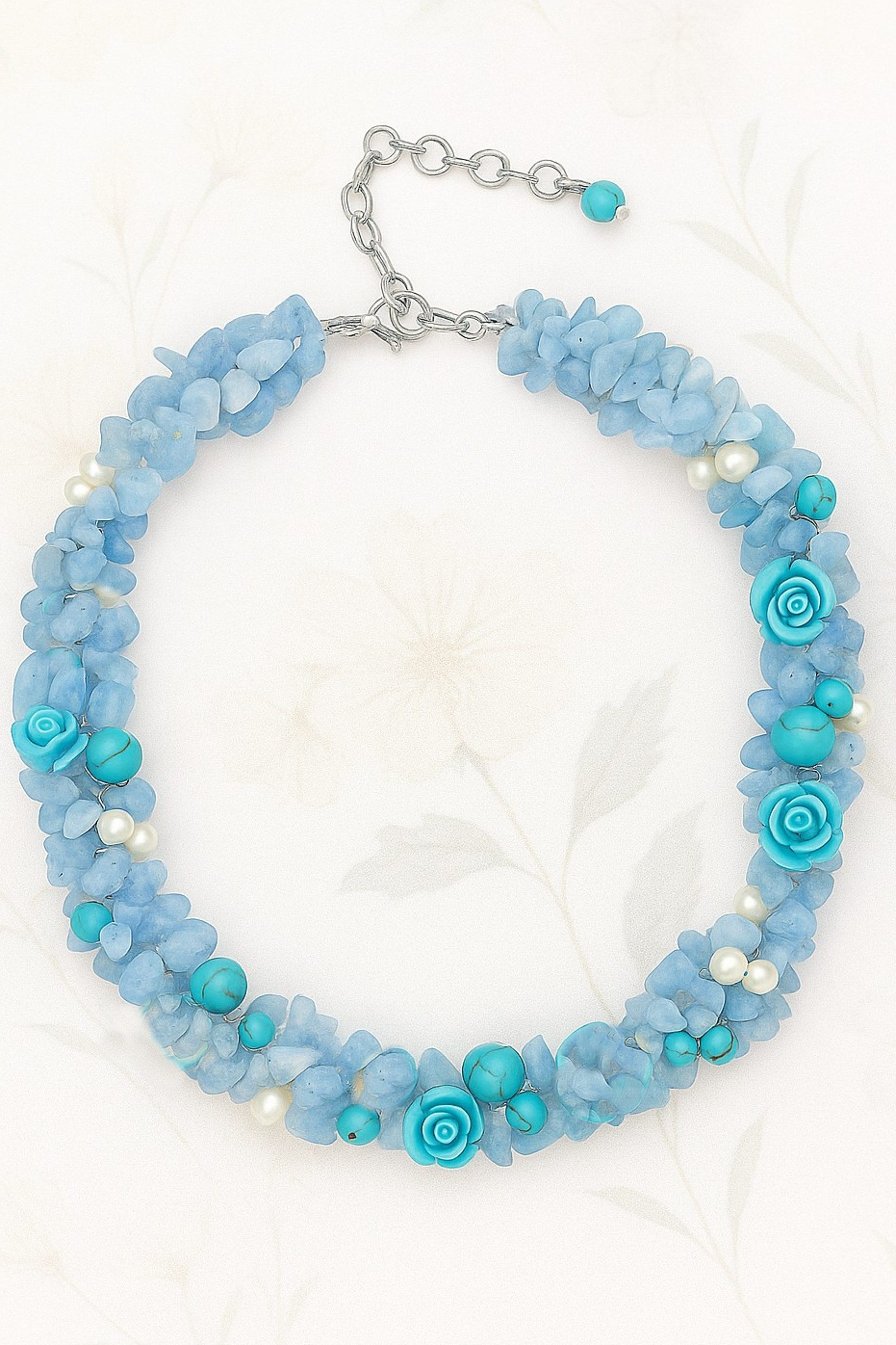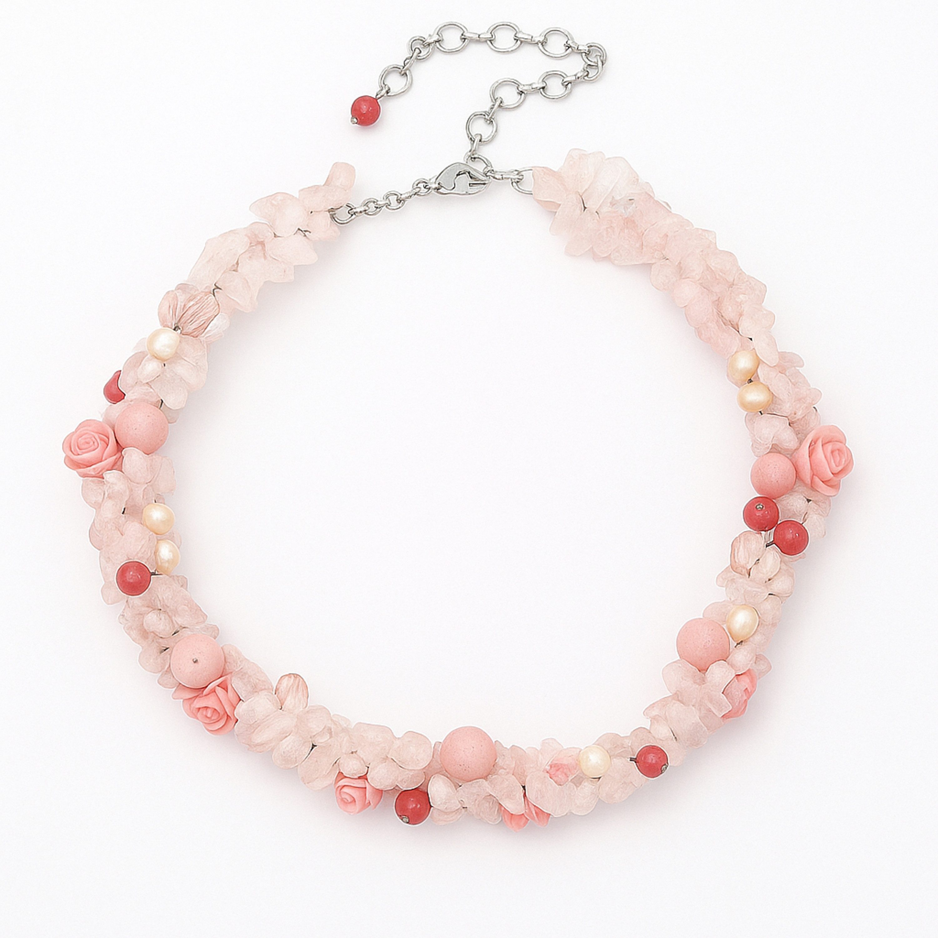 Diese charmante Statementkette vereint Romantik und Raffinesse: Glaskristalle, Harzelemente und rosafarbene Rosenblüten aus Kunstharz fügen sich harmonisch mit zarten Süßwasserperlen zu einem femininen Highlight zusammen. Die Farbkombination aus hellrosa und silber macht dieses Schmuckstück zum perfekten Begleiter für Frühlings- und Sommeroutfits. Die detailreiche Verarbeitung bringt florale Eleganz zum Ausdruck – ideal für besondere Anlässe oder um Alltagslooks einen Hauch Verspieltheit zu verleihen. Die Kette ist etwa 40?cm lang und lässt sich mit einem silberfarbenen Karabinerverschluss sowie einem 10?cm langen Verlängerungskettchen flexibel anpassen. Ob zur Hochzeit, zur Gartenparty oder einfach für ein stilsicheres Statement – Rosalia sorgt für bewundernde Blicke und ein rundum stimmiges Gesamtbild.