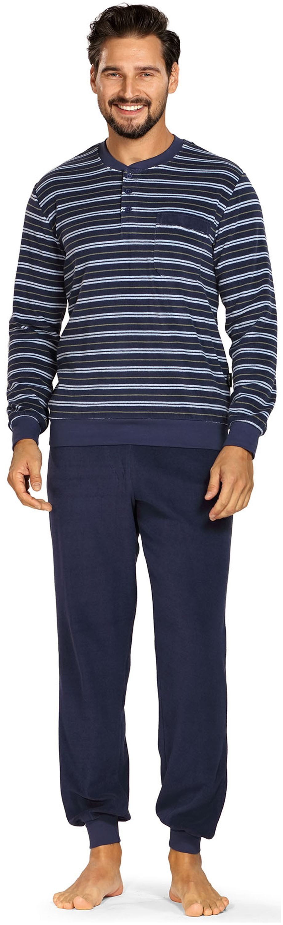 Dieser Herren Schlafanzug aus Frottee-Baumwolle ist die perfekte Kombination aus Weichheit, Komfort und klassischem Stil, ideal für entspannte Abende und erholsame Nächte. Der hochwertige Frottee-Stoff, bekannt für seine flauschige Textur und hervorragende Feuchtigkeitsaufnahme, bietet ein warmes und kuscheliges Tragegefühl. Die natürliche Baumwolle sorgt für Atmungsaktivität, sodass der Schlafanzug auch bei längerem Tragen angenehm auf der Haut liegt und ein optimales Schlafklima unterstützt.