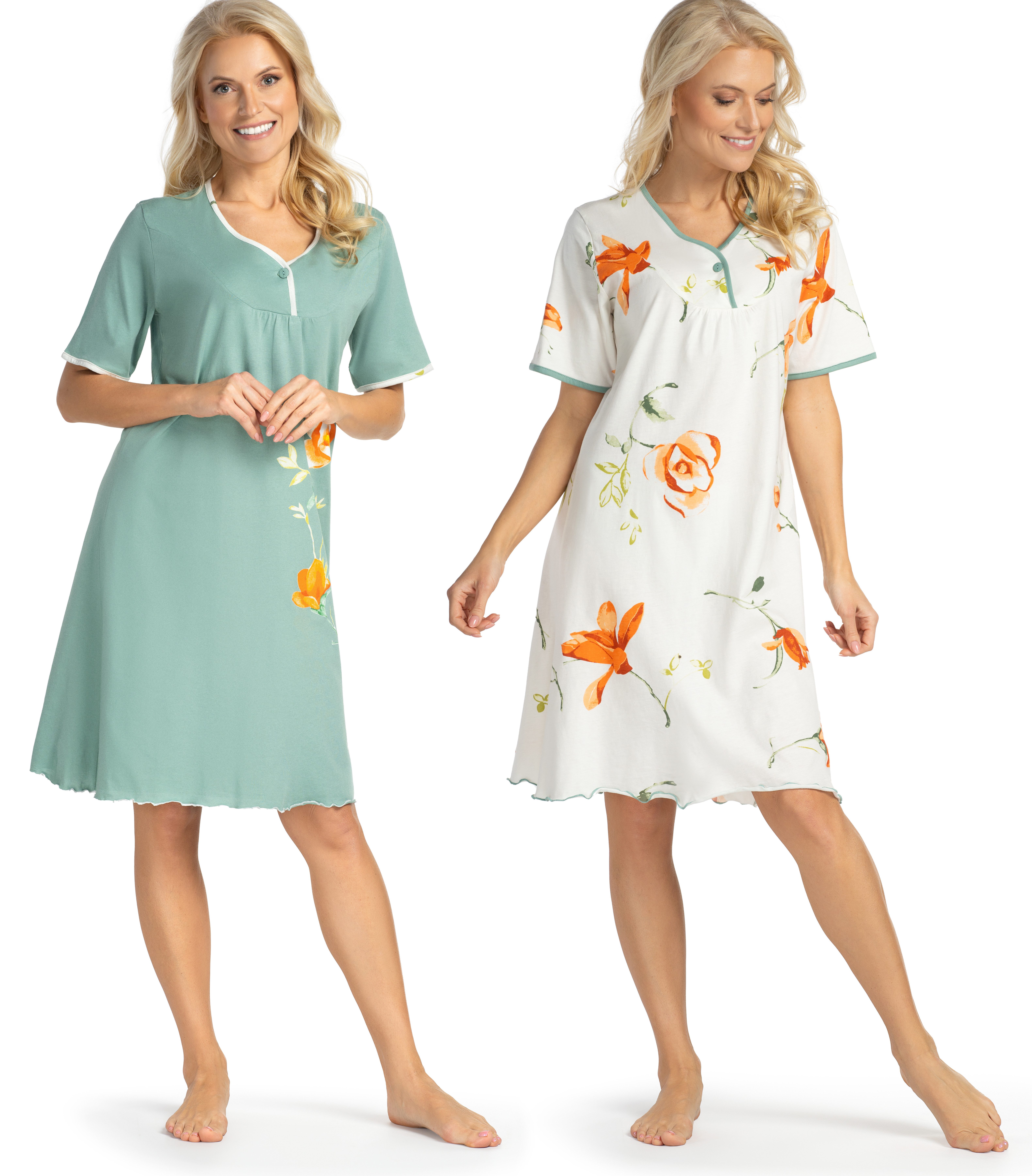 Consult-Tex Damen Nachthemd Kurzarm 2er Pack, Baumwolle-Jersey Nachtwäsche, Schlafhemd Sleepshirt, Schlafkleid Angenehmes Material: Die Nachthemden bestehen aus 100% hautsymphatischer Baumwolle-Feinjersey Qualität. Aus diesem Grund ist unser Schlafhemd für Damen leicht, weich, atmungsaktiv, hautfreundlich und bequem. Dieses Schlafhemd wird ihnen auch nach mehrfachem Waschen optimalen Komfort bieten. Design: Unsere Nachthemden wurden so entworfen, dass sie durch ihre entspannte Passform für eine angenehme Luftigkeit sorgen. So bleiben Sie auch in warmen Nächten kühl und halten unbequemes Nachtschwitzen in Schacht. Auf den Nachthemden befindet sich einmal nur ein floraler Motivdruck, das 2. Modell ist in einem allover Blumen-Druckdessin aufgemacht. Vielseitig einsetzbar: Lässige und bequemes kurzärmlige Nachthemden für entspannte Tage und wohlige Nächte. Ideale Wahl für Frauen, die Komfort zu schätzen wissen und auf bequeme Loungewear Wert legen. Perfektes Geschenk: Für ihre Freundin, Frau, Mutter, Schwestern oder Freunde zum Geburtstag, zu Weihnachten, am Valentinstag, oder jeglichen anderen Anlässen. Das klassische Design unserer Nachtwäsche sorgt in jedem Fall für Freude beim Beschenkten. Unser Vorteil ist: Unsere Produkte aus europäischer Produktion werden direkt aus unserem Lager in Deutschland versendet, dadurch können wir eine schnelle Lieferung garantieren. Unsere Nachthemden sind in vielen Größen erhältlich. Dank der lockeren Passform können Sie sich frei und ohne Einschränkungen bewegen.