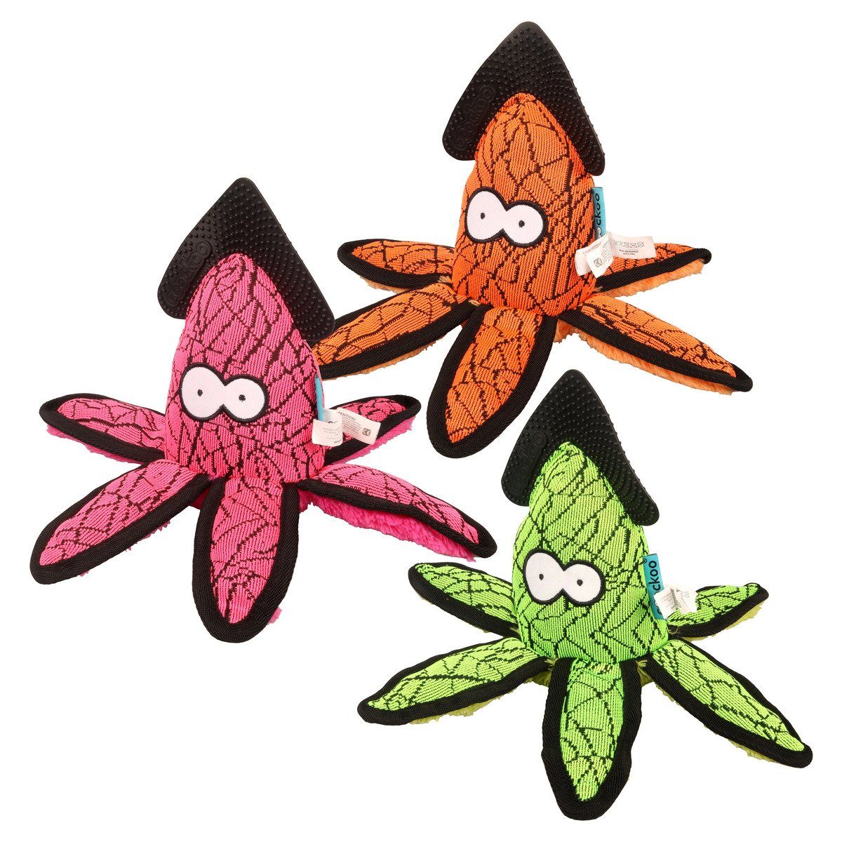 Das Hundespielzeug Cally ist ein Coockoo Plüsch-Spielzeug aus verschiedenen Stoffen. Für unbegrenztes Spielvergnügen ist in jedem der Tentakeln ein Quietscher versteckt. Das TPR-Dreieck auf seinem Kopf sorgt für noch mehr Kauspaß. Es hat dank der Noppenstruktur eine reinigende Funktion für die Zähne. Der Sneaker-Stoff, der für dieses Spielzeug verwendet wird, verleiht ihm einen einzigartigen Look. Die leuchtenden Farben und die schelmischen Augen von Coockoo sind auf jeden Fall ein Hingucker.