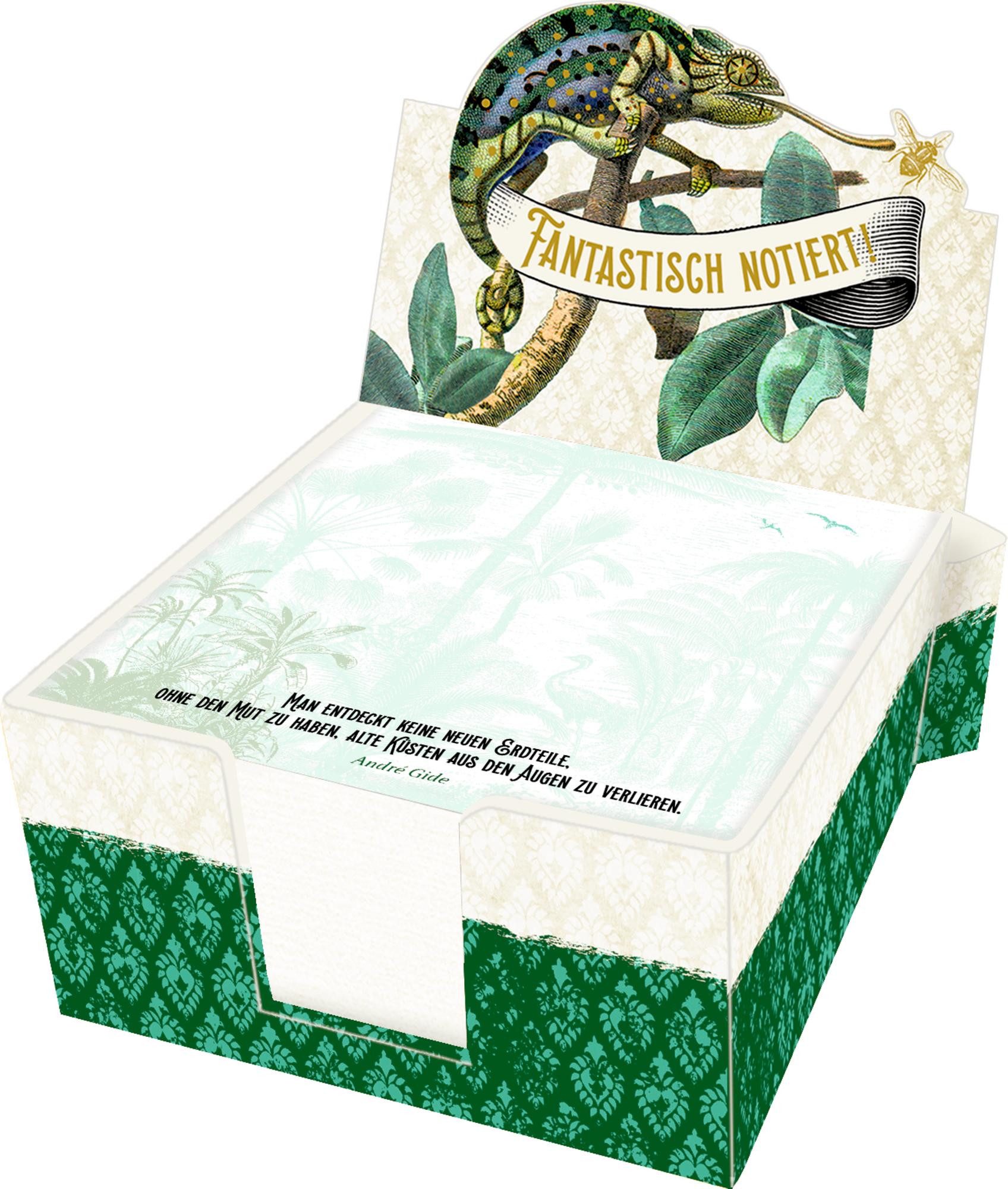 300 Notizzettel mit 50 unterschiedlichen Sprüchen in Papp-Box mit gestanztem Deckel zum Umstecken und Halterung für Stift / Deckel mit Folie / Zettel: ca. 10 x 10 cm / Box: ca. 10,3 x 4,3 x 10,3 cm; Verpackungseinheit mit 3 Ex. Einzelexemplare sind nicht beim Verlag erhältlich. Die angegebenen Preise sind Stückpreise.