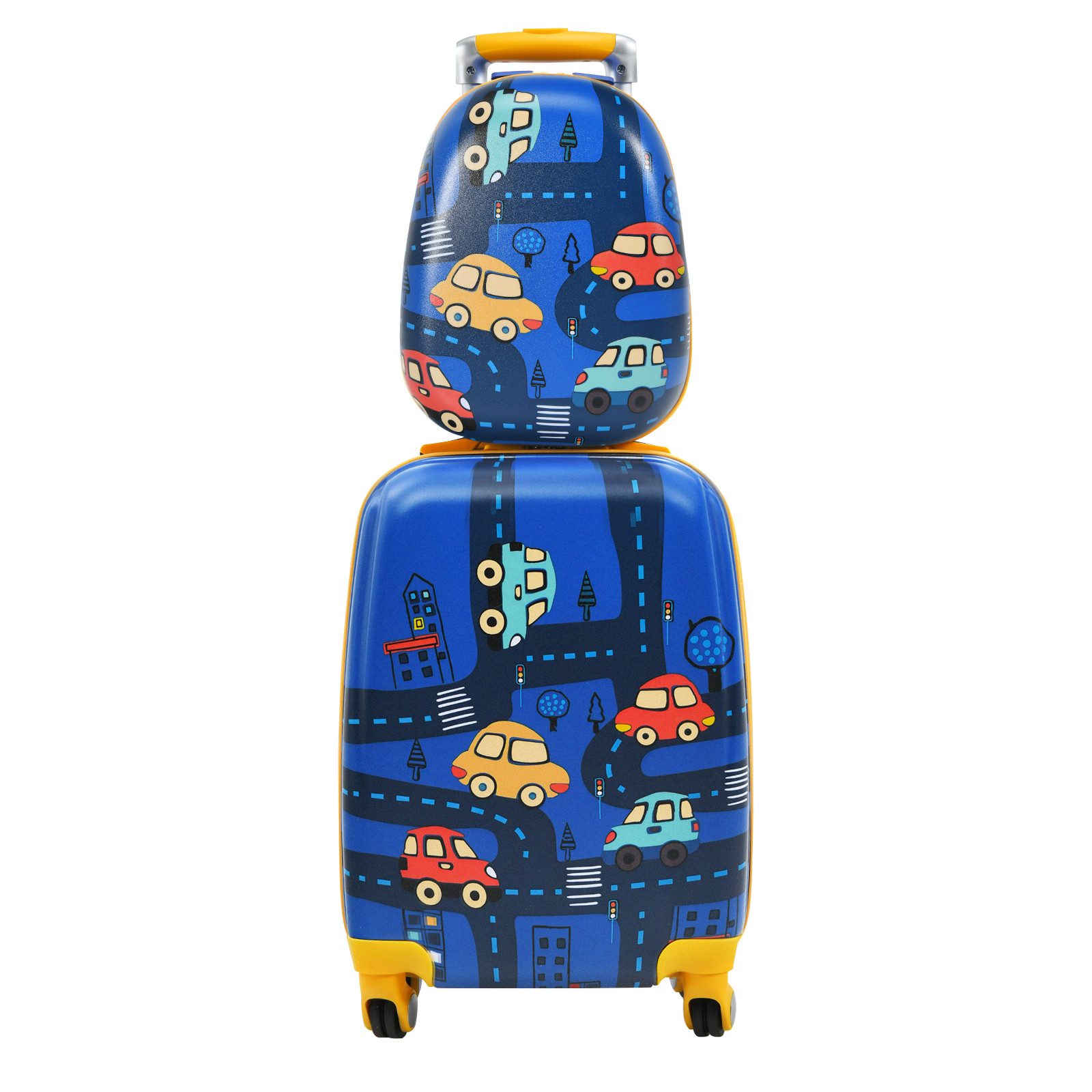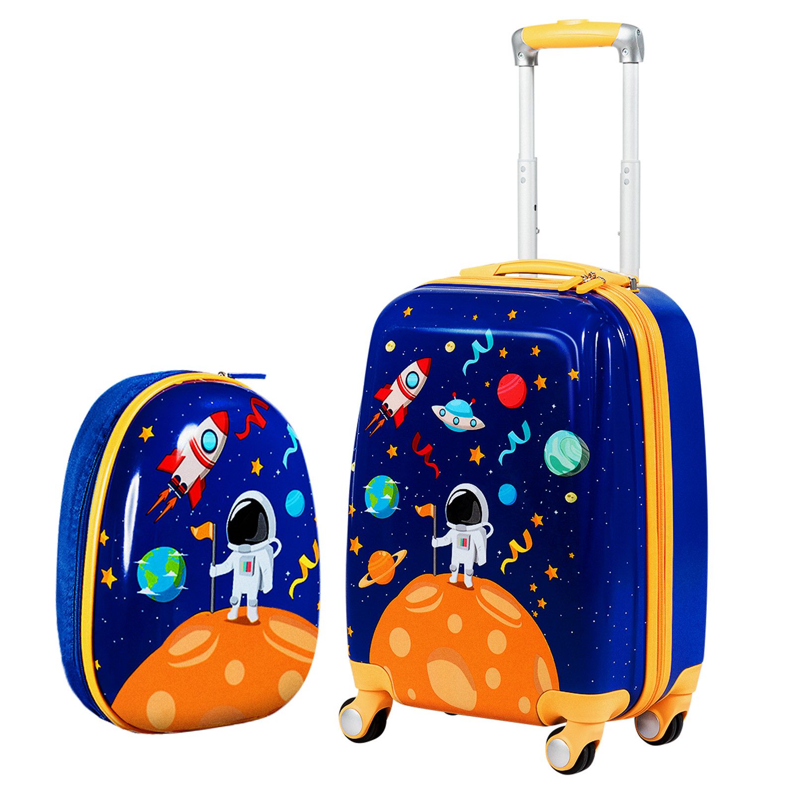 Es besteht aus einem Rucksack und einem Koffer, wobei der Rucksack mit einem elastischen Band am Koffer befestigt werden kann. Mit diesem Set kann Ihr Kind sein Gepäck allein bewegen, was die Unabhängigkeit und das Selbstvertrauen fördert. So können Kleidung, Bücher, Spielzeugeund andere Dinge bequem transportiert werden. Der Koffer hat zudem eine Seitentasche mit Reißverschluss. Durch die vier Rollen und den verstellbaren Griff ist er für Kinder leicht zu bewegen. Aus hochwertigem ABS mit einer Schutzfolie gefertigt hat das Set eine wasser- oder verschleißfeste Oberseite.