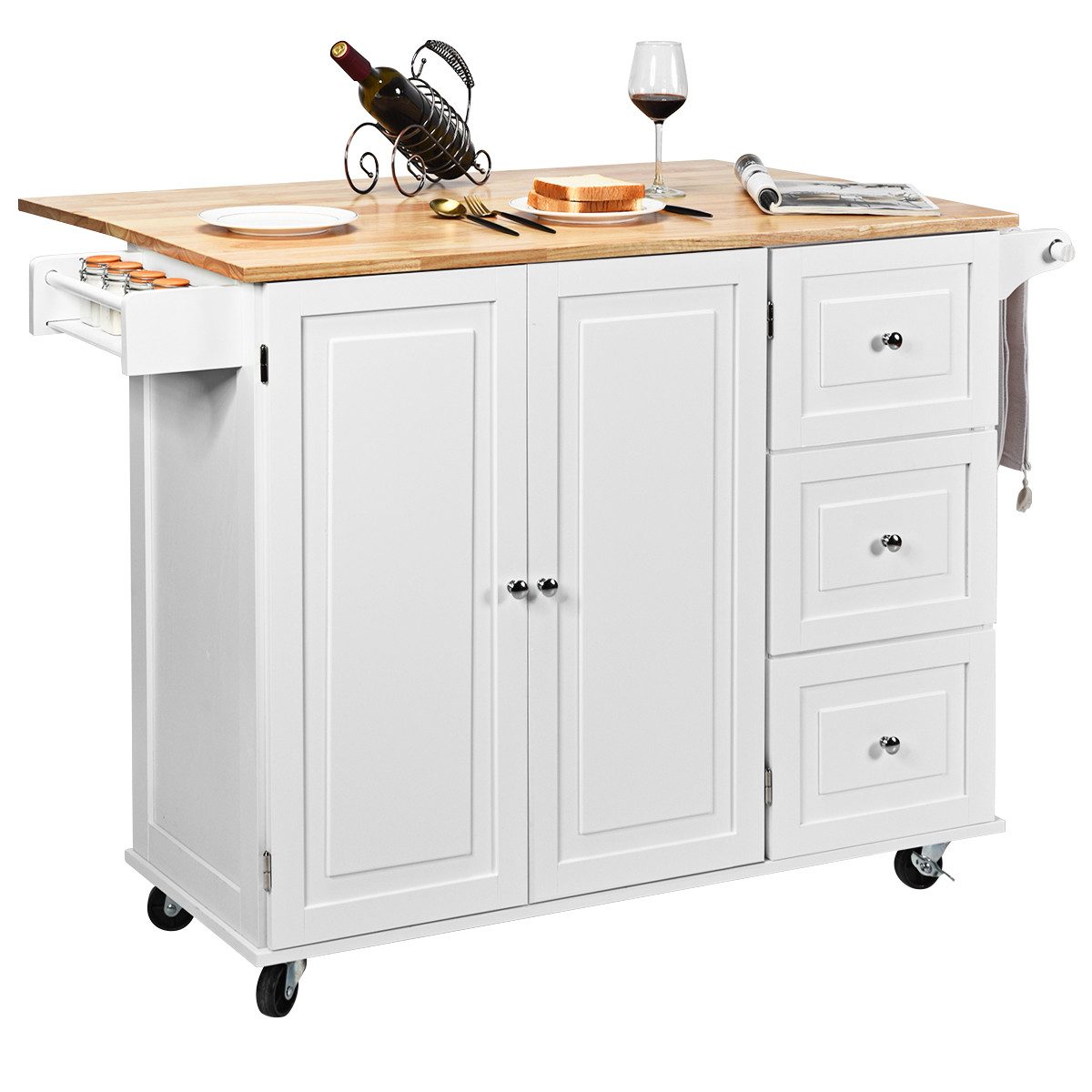 Die Kücheninsel sorgt für eine ordentliche und saubere Küche! Durch den großen Stauraum kann unser Servierwagen wirklich ein hilfreiches Aufbewahrungsmöbel für Sie sein. Mit seinen 3 großen Schubladen, einem zweitürigen Schrank und einem geräumigen Gewürzregal an der Seite können Sie Ihre Gegenstände in Ordnung halten. Darüber hinaus kann die klappbare Arbeitsplatte erweitert oder heruntergelassen werden, um dem Bedarf einer größeren Arbeitsfläche gerecht zu werden oder für eine einfache Aufbewahrung klein zu sein. Von den 4 universellen Gummirollensind 2 mit Bremsen ausgestattet, was dem Küchen-Trolley eine hohe Mobilität gibt, wodurch er überallhin bewegt und bequem angehalten werden kann.