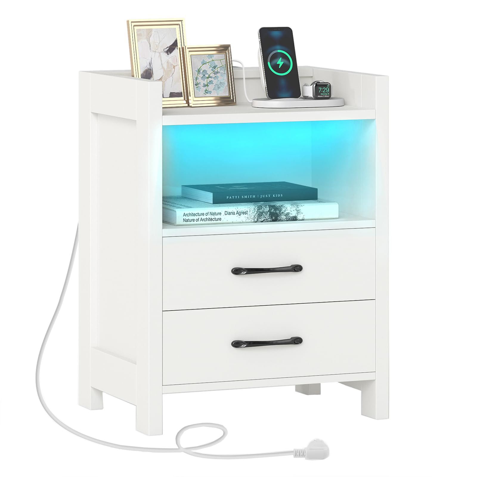 Die integrierten LED-Lichter ermöglichen es Ihnen, die perfekte Stimmung einzustellen, die einfach an jede Atmosphäre oder Gelegenheit angepasst werden kann. Das Laden Ihrer Geräte ist dank der eingelassenen Stromleiste kinderleicht – keine zusätzlichen Adapter nötig! Mit einer geräumigen Tischplatte, offenem Regal und 2 praktischen Schubladen hält dieser vielseitige Beistelltisch Ihre Essentials stets griffbereit. Dieser LED-Nachtschrank kombiniert zeitgemäßen Stil mit praktischem Stauraum am Bett und verleiht Ihrem Zuhause einen frischen und schlanken Look.