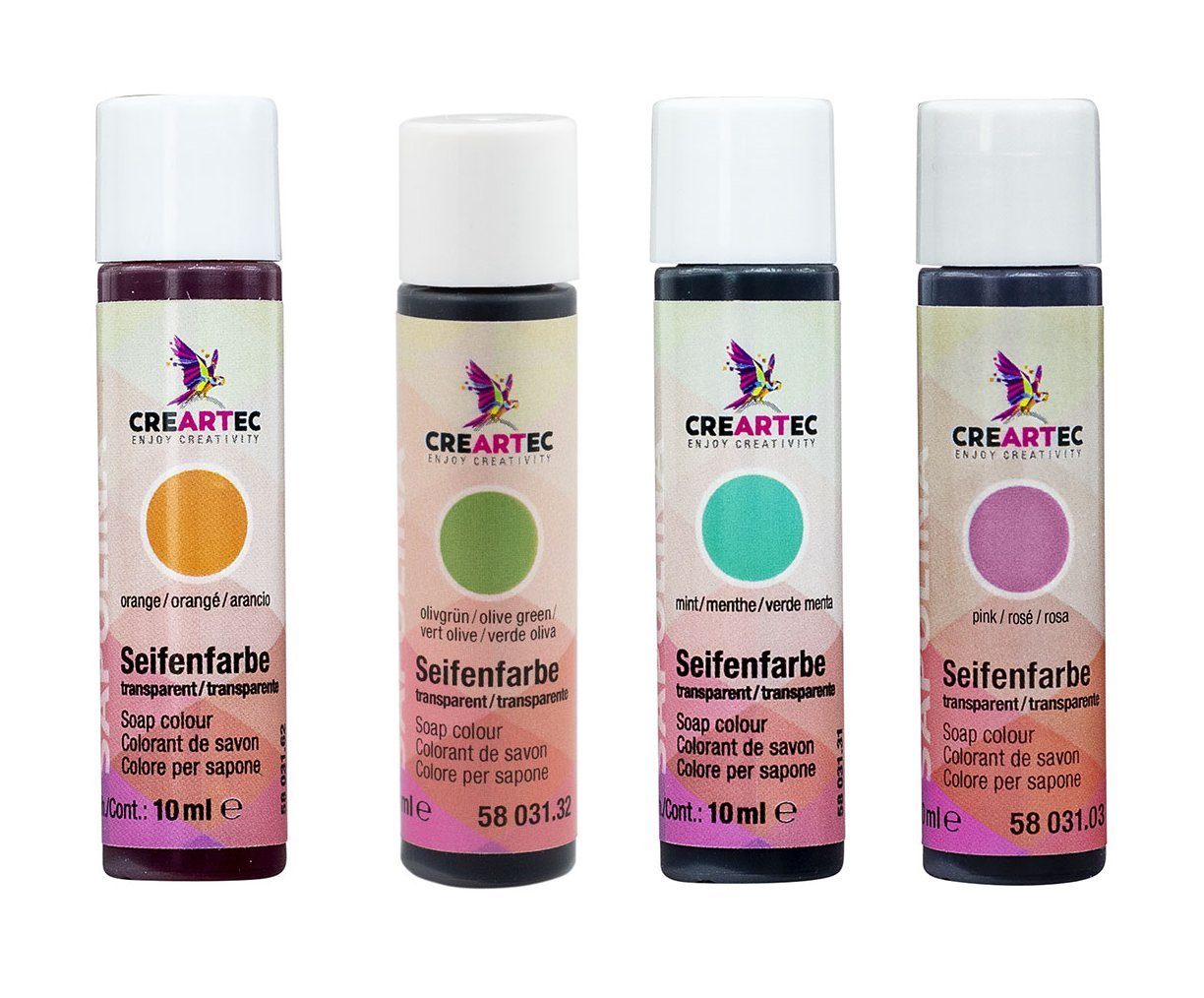 Die transparenten Seifenfarben, hergestellt auf der Basis von kosmetischen Glyzerin, eignen sich ausgezeichnet zum Einmischen in geschmolzene, farblose oder weiße Seifenmasse. Durch das Einmischen unterschiedlicher Seifenfarben besteht die Möglichkeit, die Seifenmasse in jedem gewünschten Farbton einzufärben. Beim Einmischen dieser Farben in die weiße Seifenmasse verfärbt sich diese pastellartig. Die Zugabemenge ist abhängig von der Farbintensität und beträgt ungefähr 1 – 3 %.