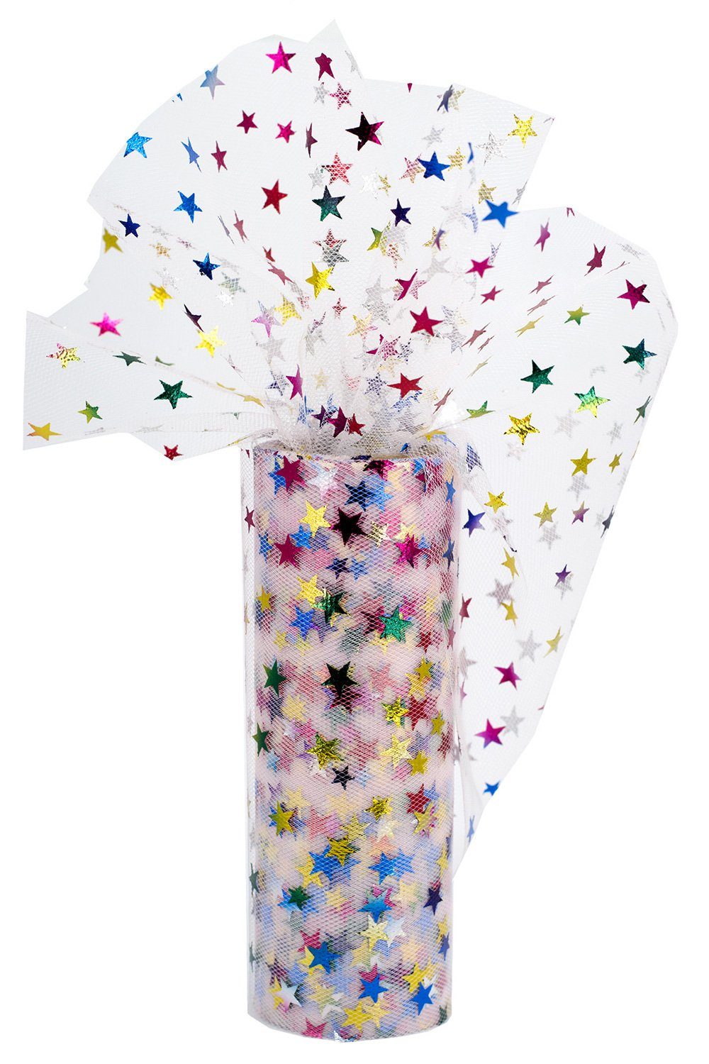 Tüllrolle / Tüllstoff / Dekostoff / Tüllband / Tüll mit Sternen 15cm x 9m auf Rolle Material: Textil, Tüll - Stoff, 100% Polyester - Breite: 15 cm - Inhalt: 9 m auf Rolle - Gewicht: ca. 15 g/m2 - Farbton: weiß - bunt: pink, lila, blau, grün, gold, silber - Pflegehinweise: waschbar bei 30 Grad, nicht bügelfähig, nicht bleichen - fein, netzartig, transparent, farbecht, hochwertig - mittelweich, kratzt die Haut nicht und hat genügend Stand, um Volumen zu bringen - beidseitig verwendbar, die Sterne in Regenbogen Farben sind auf der hinteren Seite silber - hervorragend zum Basteln, Dekorieren oder zum Nähen von Faschingskostümen und Tütüs - franst beim Schneiden nicht aus, lässt sich auch gut falten, kleben, tackern, binden, nähen Unser feiner, weißer Tüll mit glänzenden, bunten Sternen auf Rolle eignet sich hervorragend für kreative Nähprojekte und Bastelarbeiten. Ob Sie nun einen Tüllrock, Petticoat, Tütü Rock oder ein Kostüm nähen, eine Schultüte oder Pompons basteln, einen Blumenstrauß oder Vasen verzieren möchten - mit dieser Tüllstoff Rolle kreieren Sie stilvolle Accessoires und Dekorationen. Auch als Stuhlschleifen oder Säulen Deko verwendet, zaubert das Feintüll Dekoband eine verspielte Atmosphäre und verleiht jedem festlichen Anlass eine fröhliche Note. Aus dem Dekotüll lassen sich außerdem luftige Schleifen binden, um Geschenke und Windeltorten schön zu verpacken. Als Ergänzung Ihrer Partydeko oder Geburtstagsdeko unterstützt breites Tüll Band durch seine Farbe das Farbkonzept der Veranstaltung. Muster & Motiv: glänzende Rainbow Sterne, Sternchen, Sternmuster, Sternenmuster, gemustert - Anlässe & Saison: Baby Shower, Babyparty neutral, Geburt, Kindergeburtstag, Geburtstag, Schulanfang, Einschulung, Fasching, Karneval, Gartenparty, Frühling & Sommer - Passend zum Thema & Mottoparty: Party mit Motto 70er, 80er Jahre, Disco, Astronaut, Weltraum, Galaxy & Weltall, Universum - Stil & Aufmachung: mehrfarbig, durchsichtig, mit Schimmer
