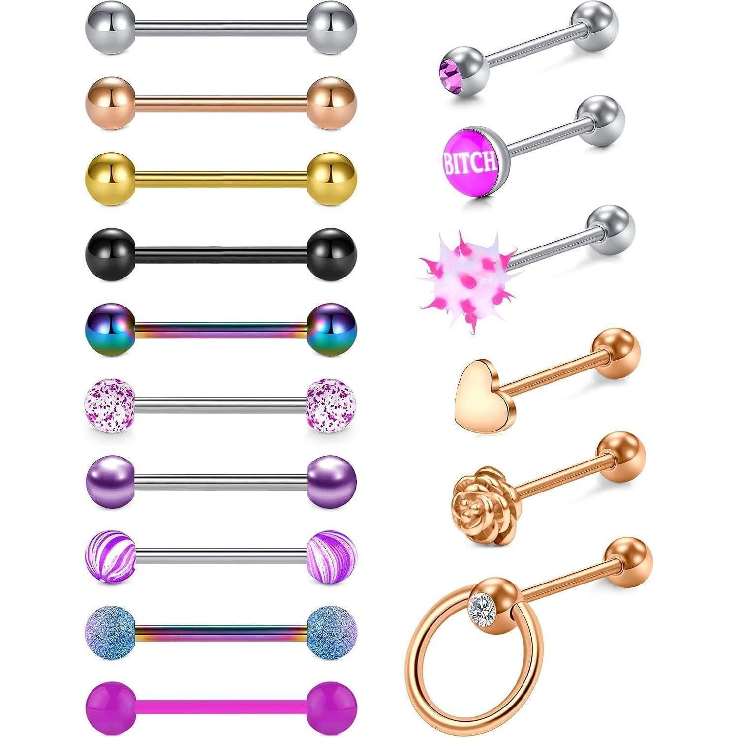 Das D.Bella 14G Zungenpiercing Set ist das perfekte Geschenk für besondere Anlässe wie Geburtstage, Weihnachten, Jahrestage und Valentinstag. Das Set enthält 16 Stück Zungenpiercing in verschiedenen Stilen, darunter Herz- und Blumendesigns, um alle Bedürfnisse und Vorlieben zu befriedigen. Hergestellt aus hochwertigem Chirurgenstahl ist dieses Piercing-Set langlebig, bequem und sicher für den täglichen Gebrauch. Die Gauge Größe beträgt 14G (1.6mm) mit einer Stablänge von 16mm und einer Kugelgröße von 5mm, was den Standardgrößen für Zungen- und Nippelpiercings entspricht. Der Schmuck ist blei- und nickelfrei, was ihn perfekt für empfindliche Haut macht und ein Verblassen oder Verformen verhindert. Holen Sie sich jetzt das D.Bella Zungenpiercing Set und verleihen Sie Ihrem Look einen Hauch von Eleganz und Individualität.