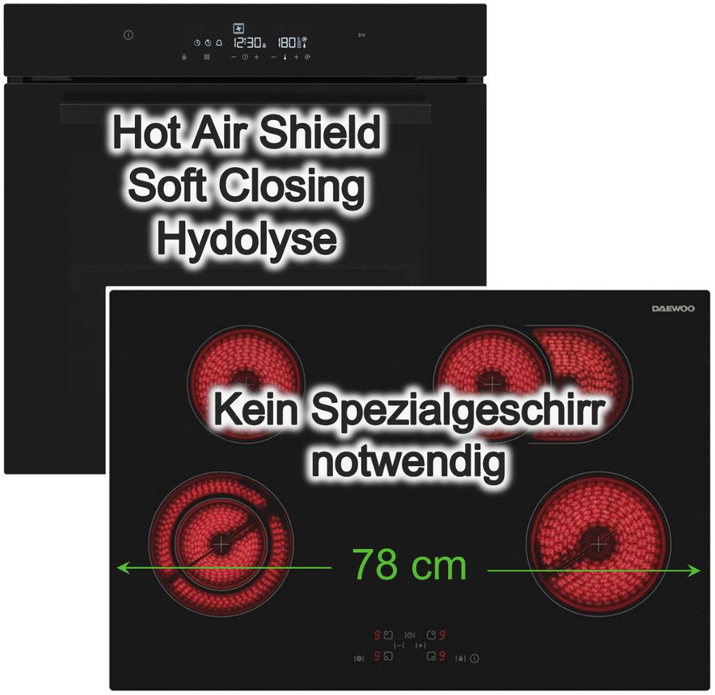 Mit dem DAEWOO Set aus Einbaubackofen BO7HY68GBNMDE und Kochfeld BH7VTF10BNLDE wird Ihre Küche zum flexiblen Kochzentrum. Der Backofen überzeugt mit großem 73-Liter-Garraum, 10 Heizarten und innovativem HeatWrap-System für perfekte Ergebnisse auf bis zu fünf Ebenen. Die hydrolytische Dampfreinigung erleichtert die Pflege, während SoftClosing und Hot Air Shield Komfort und Sicherheit bieten. Das rahmenlose Glaskeramik-Kochfeld mit Touch-Bedienung passt sich jedem Kochgeschirr an: Bräter- und Zweikreiszone bieten maximale Flexibilität, die Timer-Funktion mit Abschaltautomatik sorgt für Sicherheit. Moderne Technik trifft auf elegantes Design – ideal für Familien und anspruchsvolle Hobbyköche.