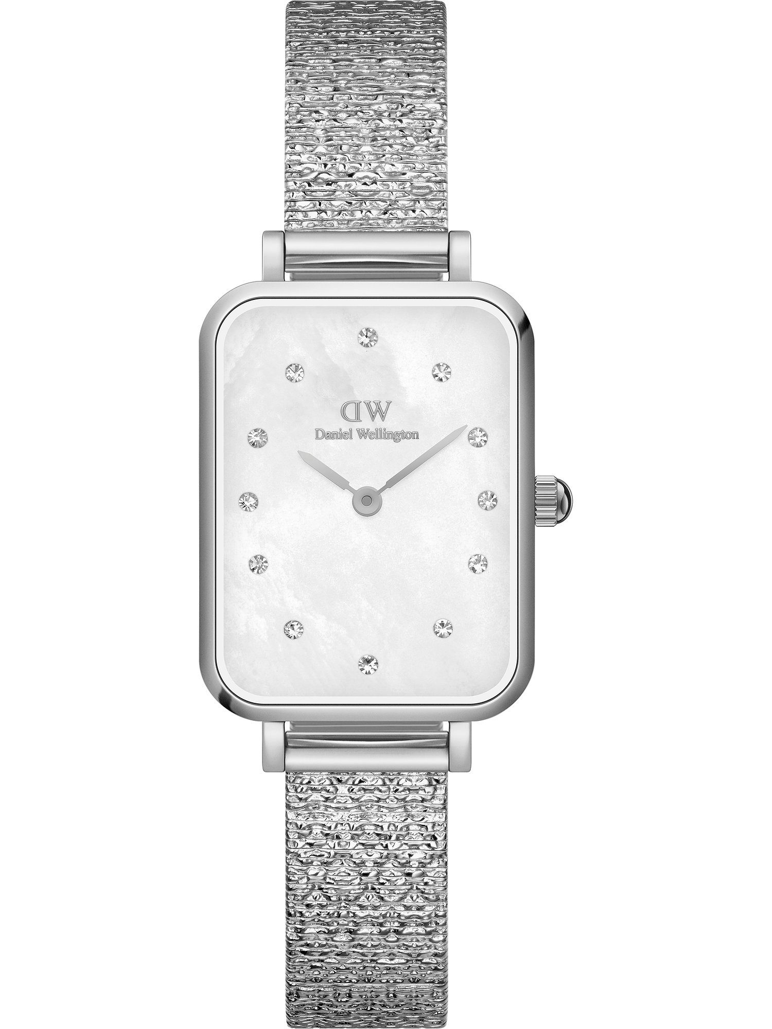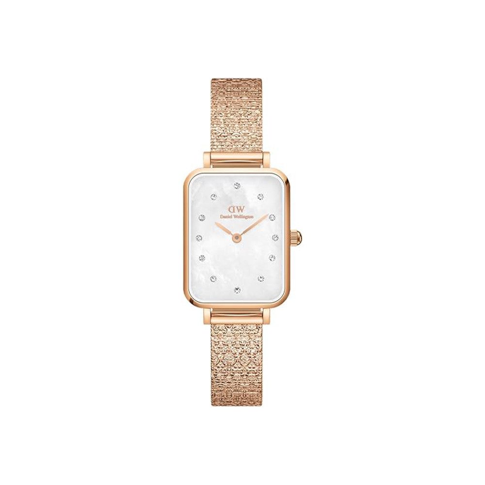 Die Uhren von Daniel Wellington sind die optimale Wahl für alle, die ein zeitloses Design bevorzugen. Die Uhrenkollektionen bieten edle Klassiker für Menschen mit exklusivem Geschmack. Diese sportlich-elegante Uhr am gleichermaßen schicken wie robusten Edelstahl-Band ist die perfekte Wahl für jede Frau, die auf der Suche nach einem zeitlosen Klassiker ist. Sowohl das Gehäuse als auch das Armband der Daniel Wellington Quadro Lumine kommen in Roségold daher, wozu das weiße Ziffernblatt harmonische Akzente setzt. Die Breite des eckigen Gehäuses beträgt 20 mm, die Länge 26 mm. Im Inneren tickt ein zuverlässiges Quarzwerk. Das verwendete Mineralglas bietet eine gute Sicht und ist widerstandsfähig gegen alle Einflüsse, die bei normalem Gebrauch entstehen. Mit einer Wasserdichte von bis zu 3 Bar ist dieser Zeitmesser spritzwassergeschützt - Regen und Händewaschen machen ihm nichts aus. Die Faltschließe garantiert sowohl leichtes Anlegen als auch sicheren Halt am Arm. Für mehr Variabilität ist das Armband leicht austauschbar - so lässt sich der Look der Uhr noch besser an verschiedene Outfits anpassen. Eins steht fest: Wer seinem Look eine individuelle Note verleihen möchte, macht mit der stilvollen Daniel Wellington Quadro Lumine Damenuhr alles richtig. Worauf wartest du also noch?