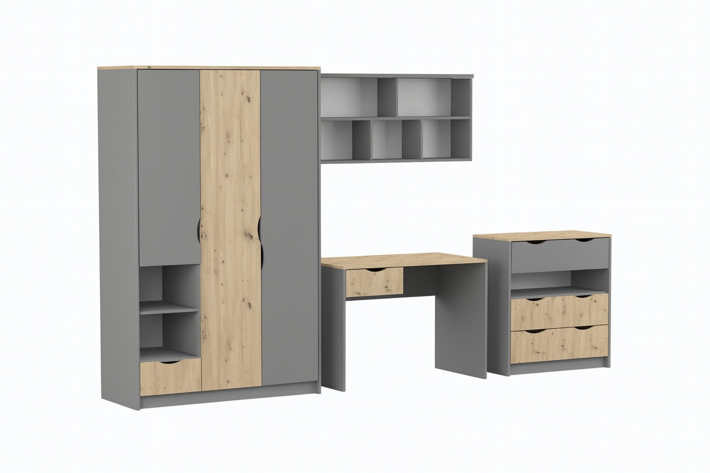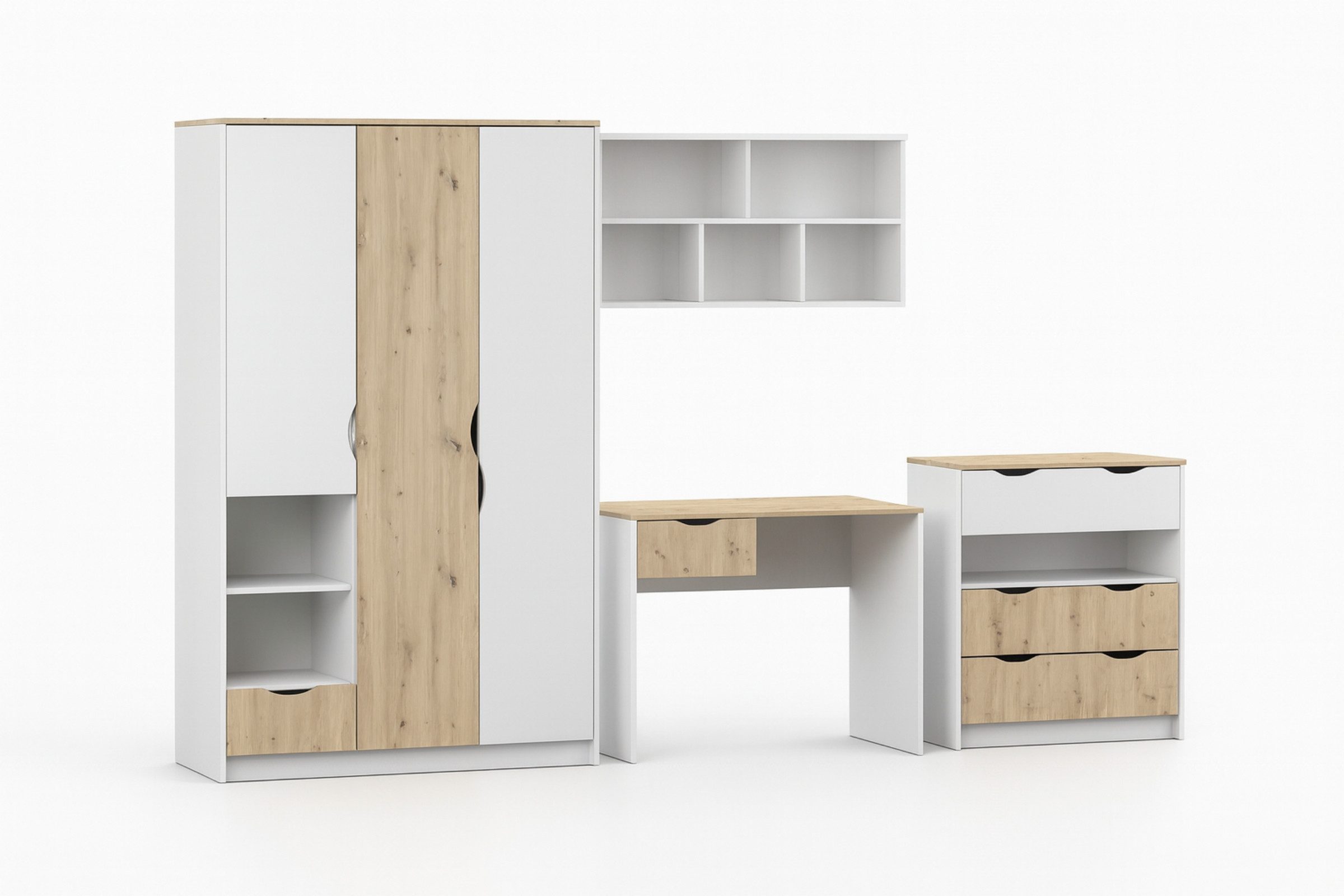 | Set beinhaltet | Kleiderschrank, Schreibtisch, Wandregal und Kommode |