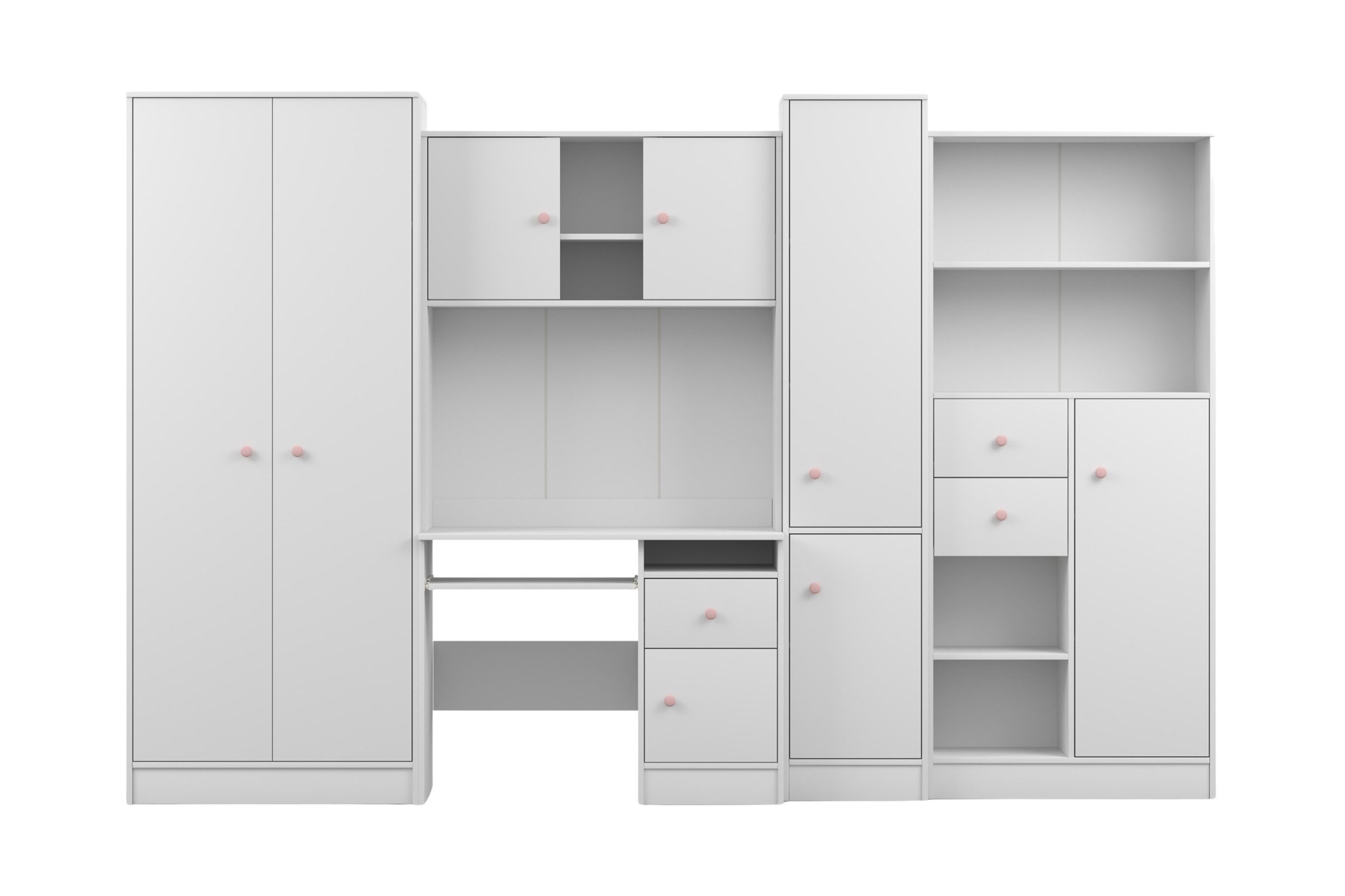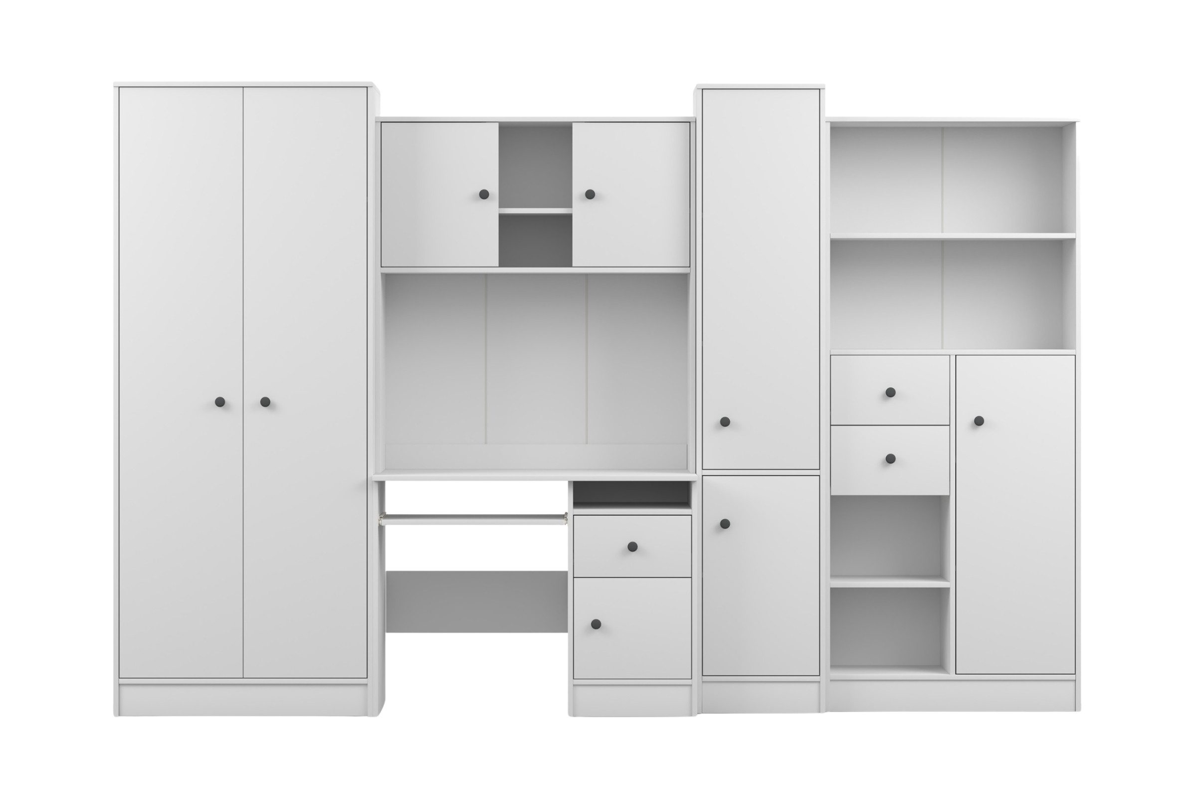 | Lieferumfang | 1x Schreibtisch mit Aufsatz 1x 2-türiger Kleiderschrank 2x Regalelemente mit Türen und Schubladen 1x Schmaler Hochschrank Montagematerial Detaillierte Aufbauanleitung Lieferung in 7 Paketen (Gesamtgewicht ca. 190 kg) |