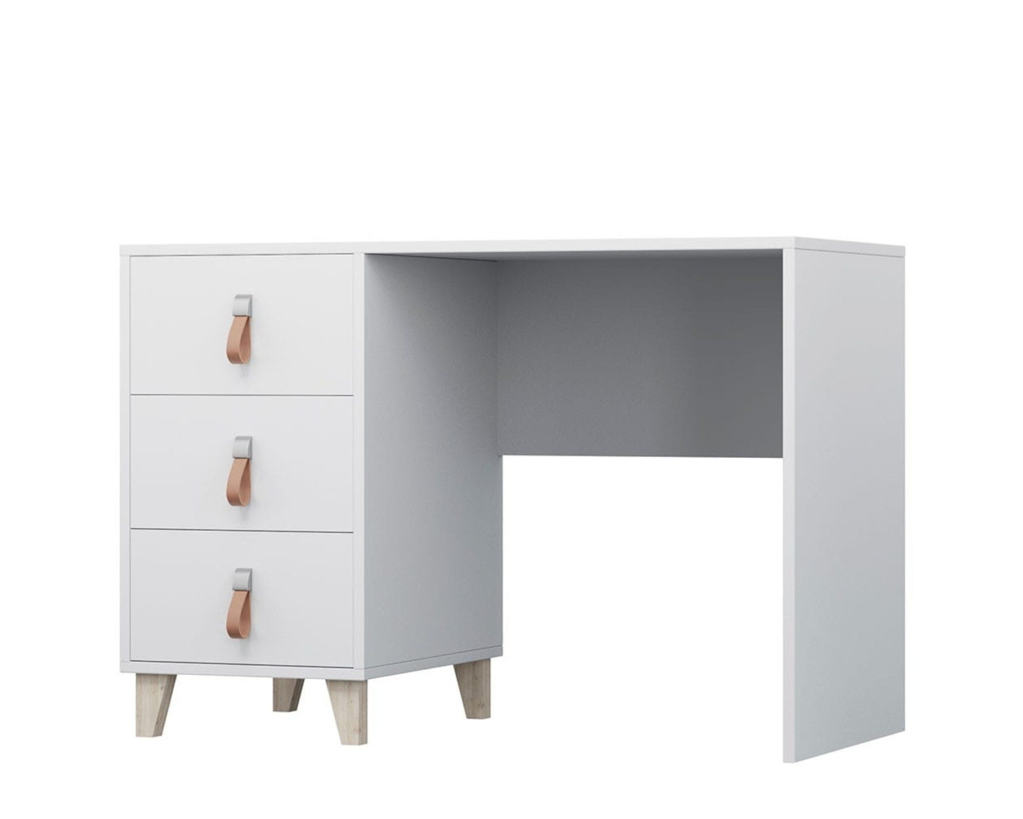 Moderne Ledergriffe tragen zum Charme der Möbel bei. Die Kanten der Möbel durch ABS-Kanten geschützt. Perfekte Möbel für ein Kinder- oder Jugendzimmer, helle Farben, moderner skandinavischer Stil.