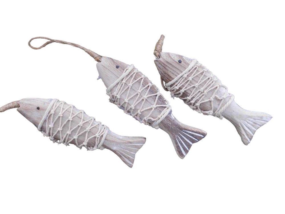 Dekohänger 3 Fische Dekohänger. 3 Fische. Jeweils an Leinenkordel. Wunderschöne, maritime Dekoration. Zauberhafte Handarbeit aus Holz. Mit Netz verziert. 3 verchiedene Längen: 50 / 41 / 35 cm Größe der Fische jeweils: 15 x 5 x 2,5 cm