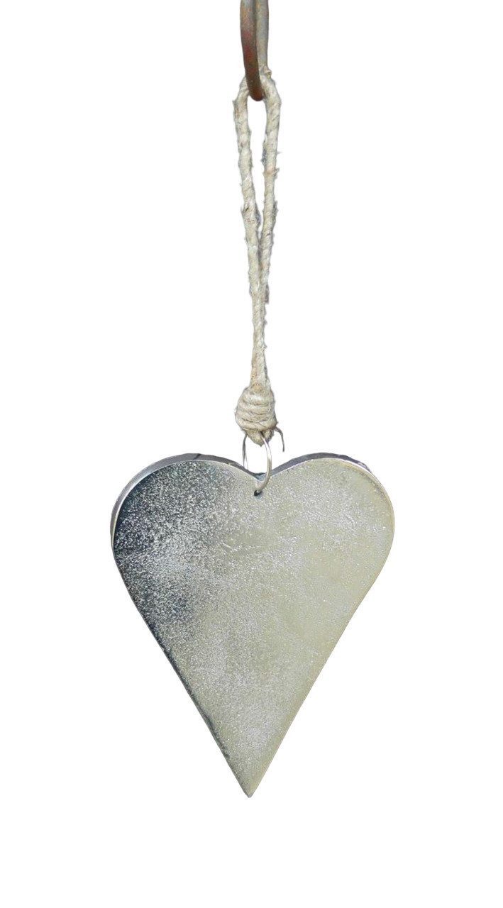 Herz / Herzhänger aus Aluminium Bezaubernd schönes Deko-Herz aus Aluminium. Massiv, silber vernickelt. Mit Metallöse und Leinenkordel zur Aufhängung. Gesamtlänge inkl. Band ca. 25 cm Größe Herz: ca. 15 x 11,5 cm. 1 cm stark.