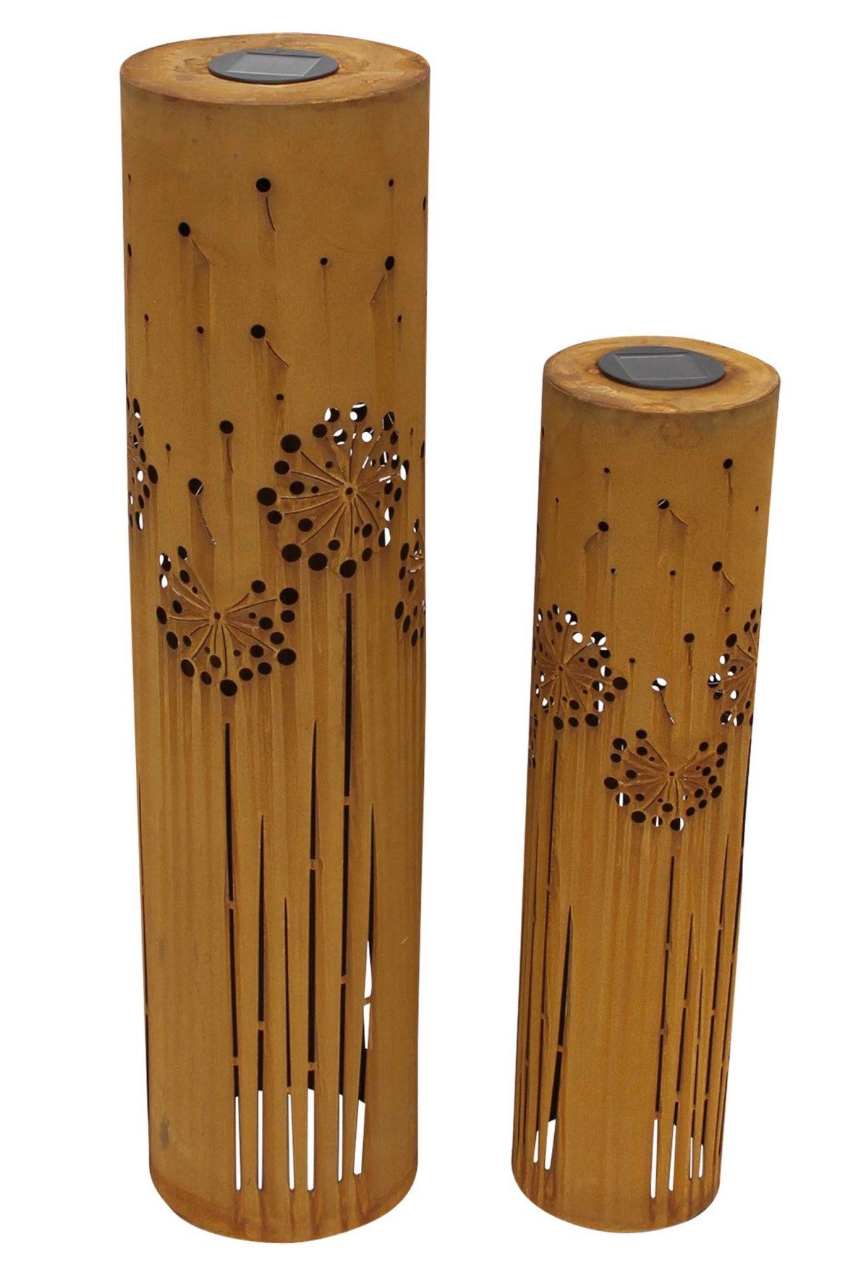 Die Gartensäulen sind aus hochwertigem Metall gefertigt und mit einem Echtrost-Finish veredelt. Dieses rustikale Finish verleiht der Gartendekoration einen charmanten Vintage-Look, der sich harmonisch in jede Gartenlandschaft einfügt. Die filigranen Ausstanzungen im Pusteblumen-Design lassen das Licht der warmweiß leuchtenden LEDs durchscheinen und erzeugen wunderschöne Muster aus Licht und Schatten.