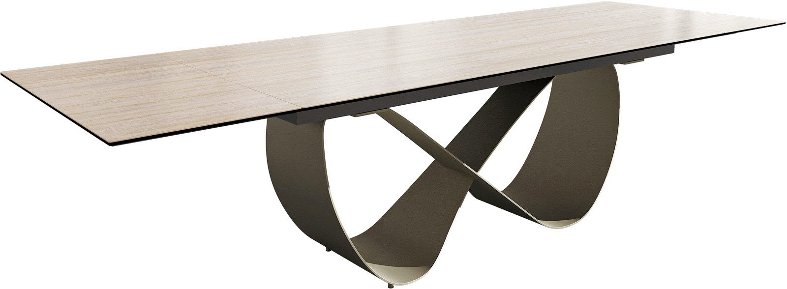 Die Tischplatte wird aus einer druchgehenden Keramikplatte gefertigt und erhält seine Einzigartigkeit in einem stimmigen Gesamtbild selbst in der Ausziehfunktion ohne Unterbrechungen oder optischen Fugen.