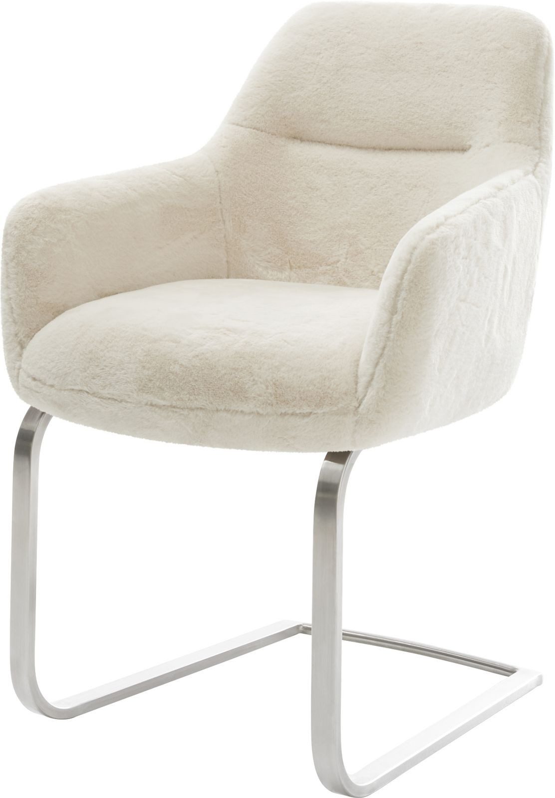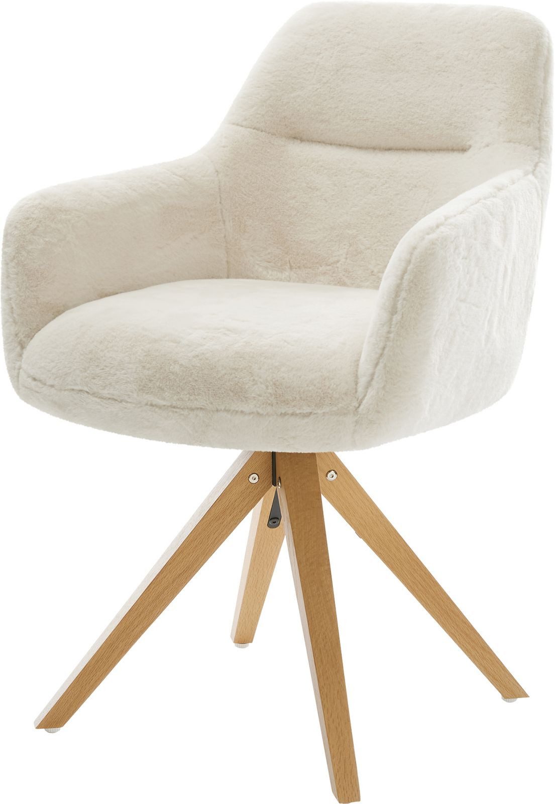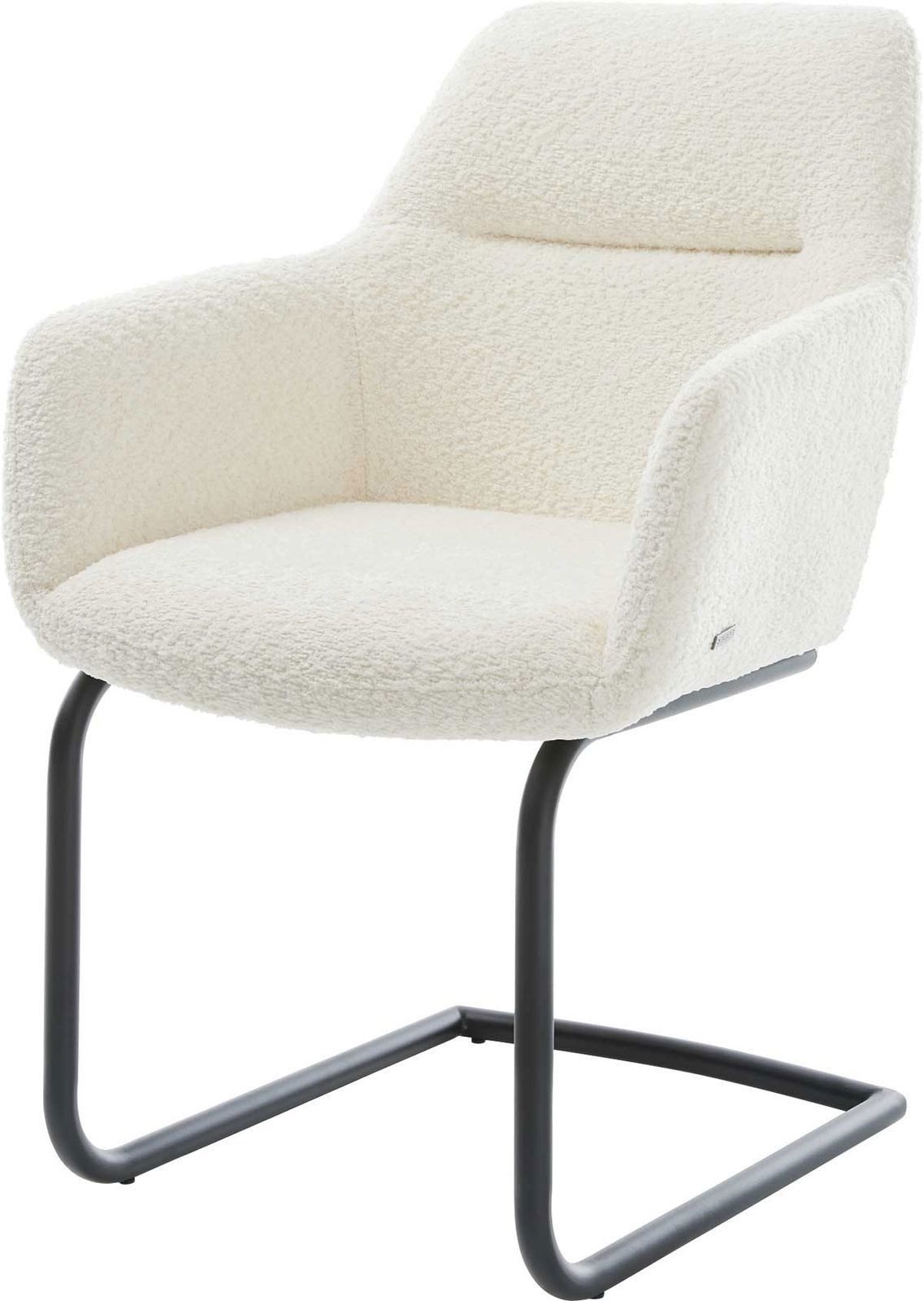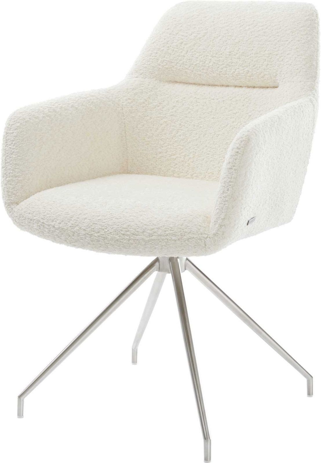 Der Esszimmerstuhl wurde mit einem besonders weichen und pflegeleichten Bouclé Stoff bezogen, der sich in einem warmen Weiß präsentiert und dem Esszimmer einen eleganten Look verleiht.