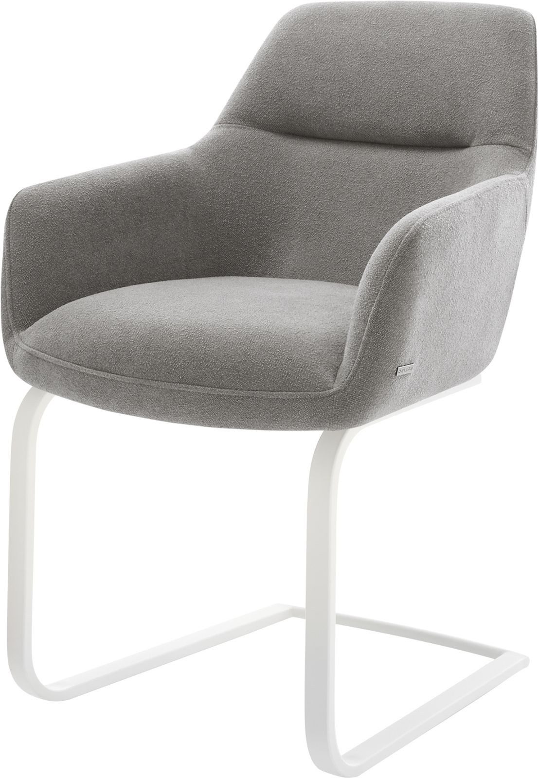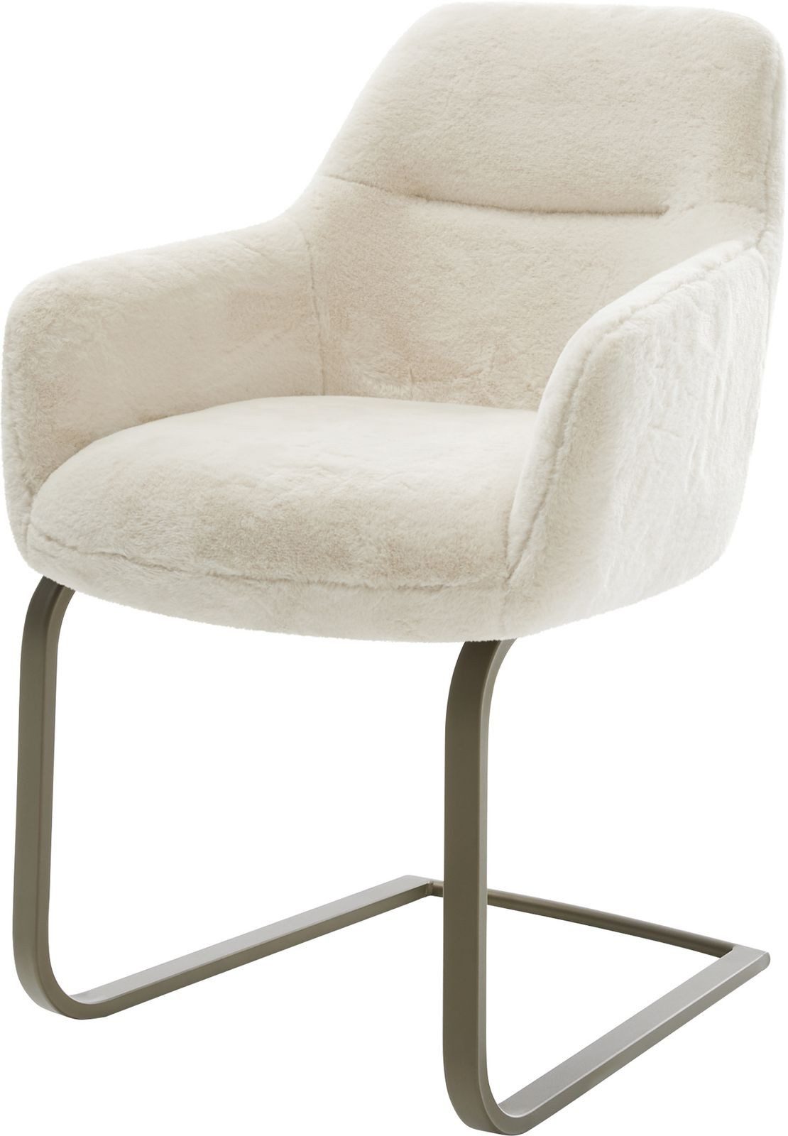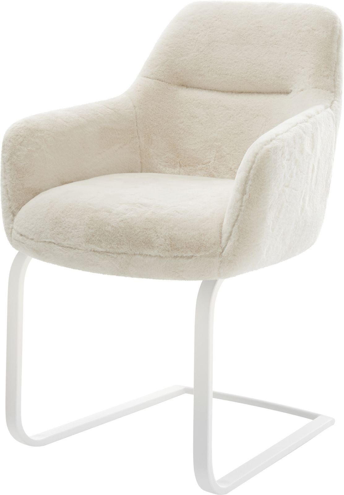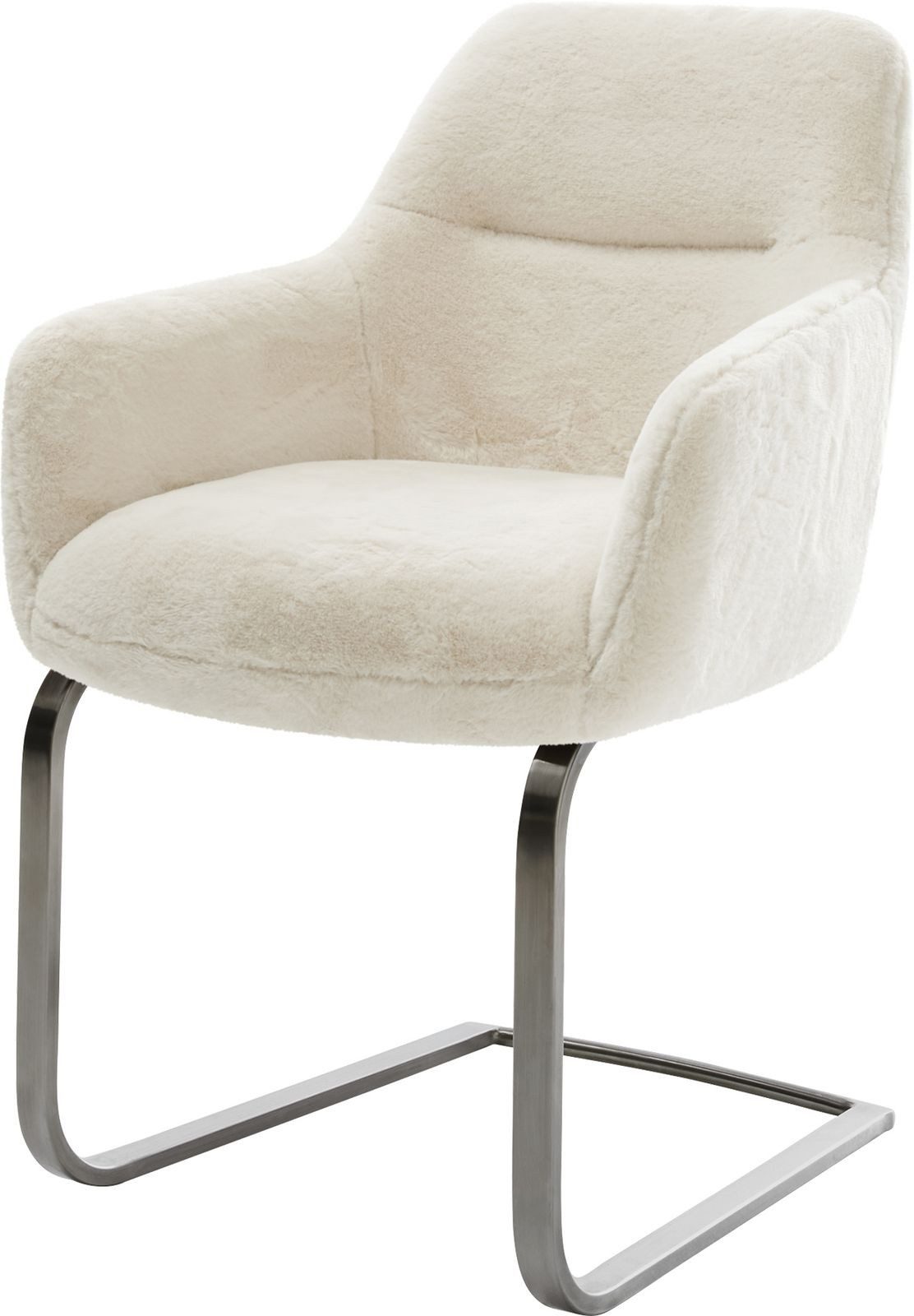 Der Esszimmerstuhl wurde mit einem besonders weichen und pflegeleichten Bouclé Stoff bezogen, der sich in einem warmen Weiß präsentiert und dem Esszimmer einen eleganten Look verleiht.