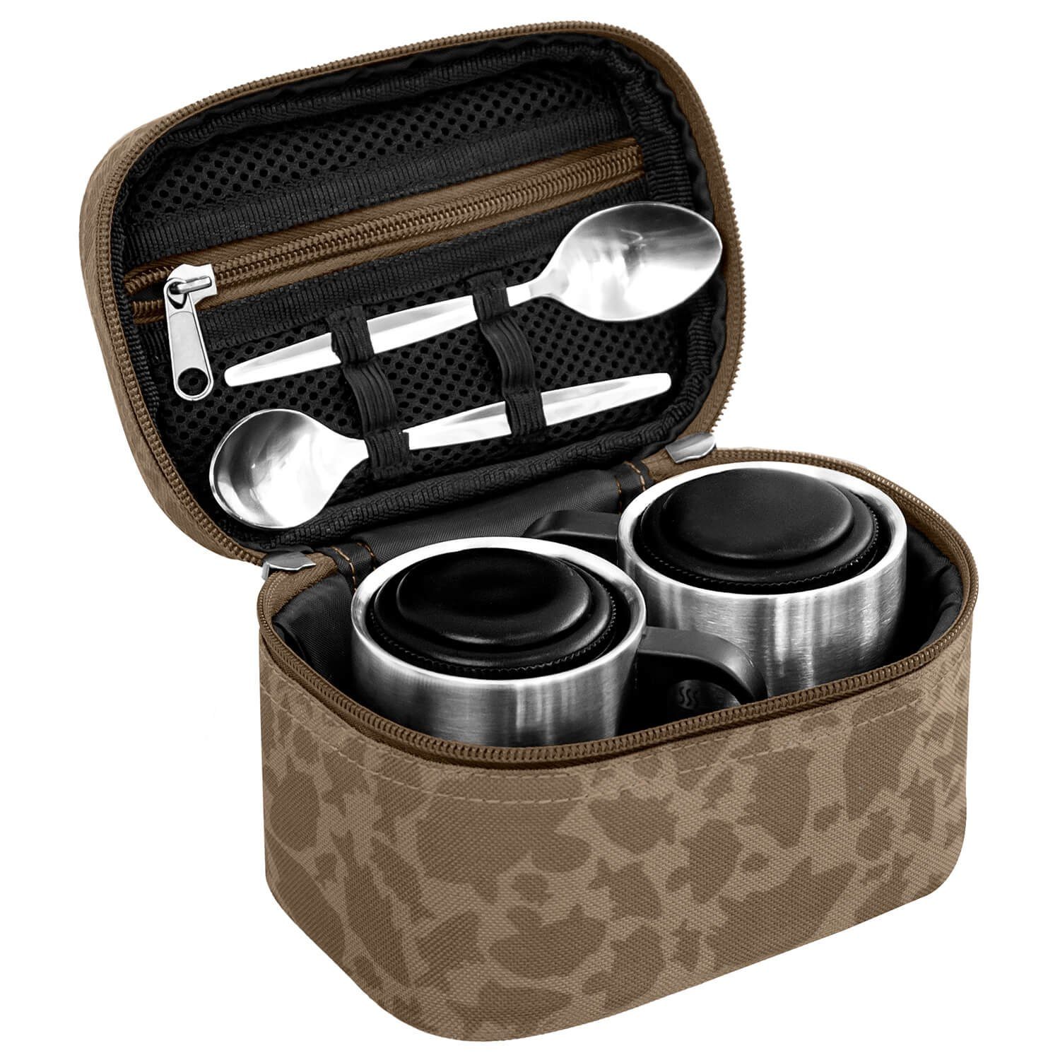 Das Set kommt in einer Basistasche, die mit ihrem kompakten Design von 17 cm x 12 cm x 10 cm kaum Platz einnimmt. Sie verfügt über eine praktische Netztasche, die genug Raum bietet, um einen ausreichenden Vorrat an Teebeuteln zu verstauen. Hochwertige Reißverschlüsse sorgen für eine sichere und langlebige Verwendung.