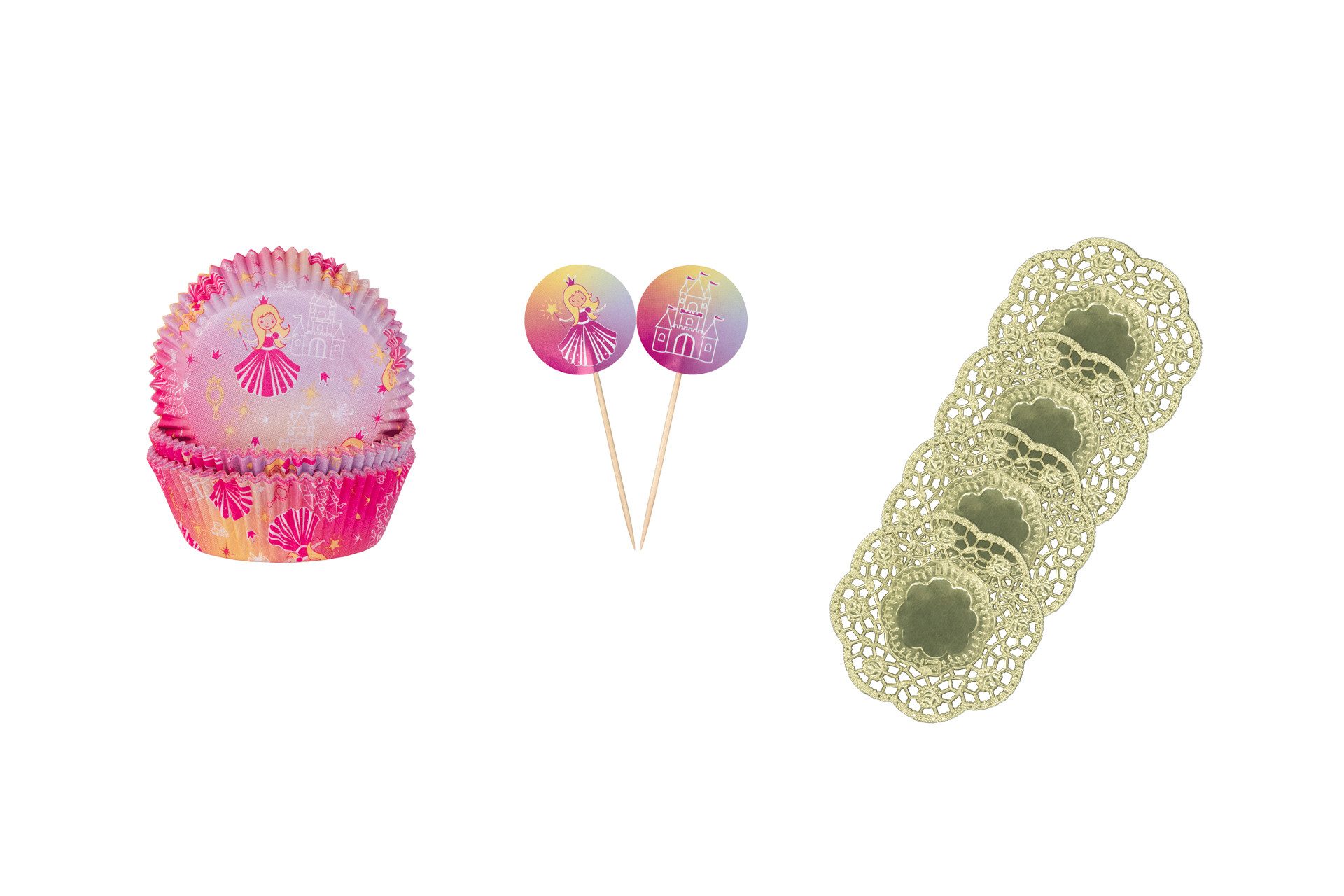 Prinzessin Muffinförmchen + Deko-Picker - Inklusive 4 Tassendeckchen Gold/Silber