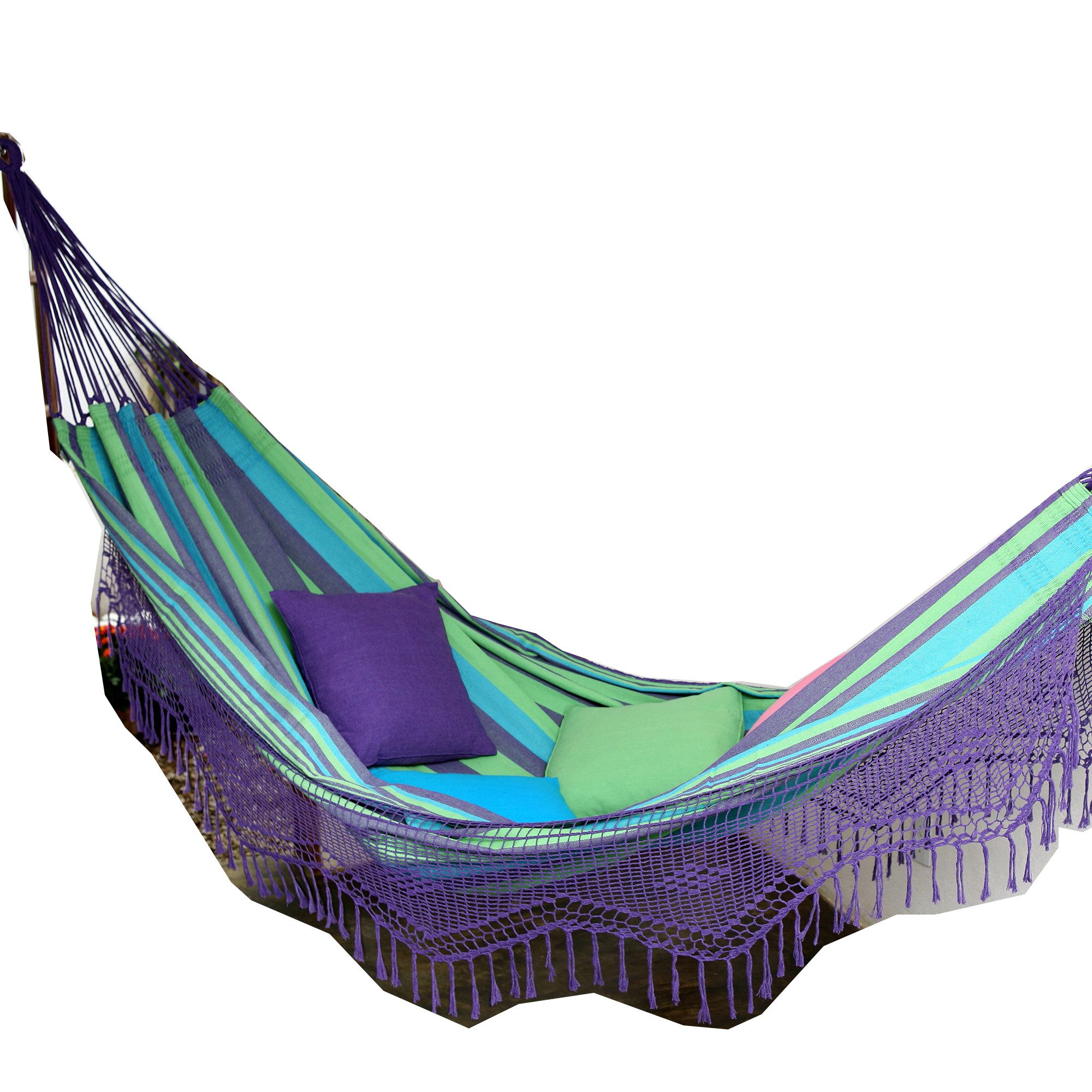 In vielen Gebieten Brasliens schlafen die Menschen nur in Hängematten. Diese sind noch heute meist handgewebt und bestehen aus einem schönen dicken Stoff. Das schwere dichte Gewebe macht sie robust und angenehm auch für kühlere Gebiete oder kühle Sommernächte. Diese sehr praktischen Hängematten werden von erfahrenen Handwerkern in einer Vielzahl von leuchtenden Farben und aufwändige Fransen hergestellt. Durch ihre verstärkte Webkante sind diese Hängematten besonders stabil und die größeren Modelle können problemlos eine ganze Familie tragen. Eine gut gearbeitete brasilianische Hängematte ist deshalb auch sehr sehr langlebig.
