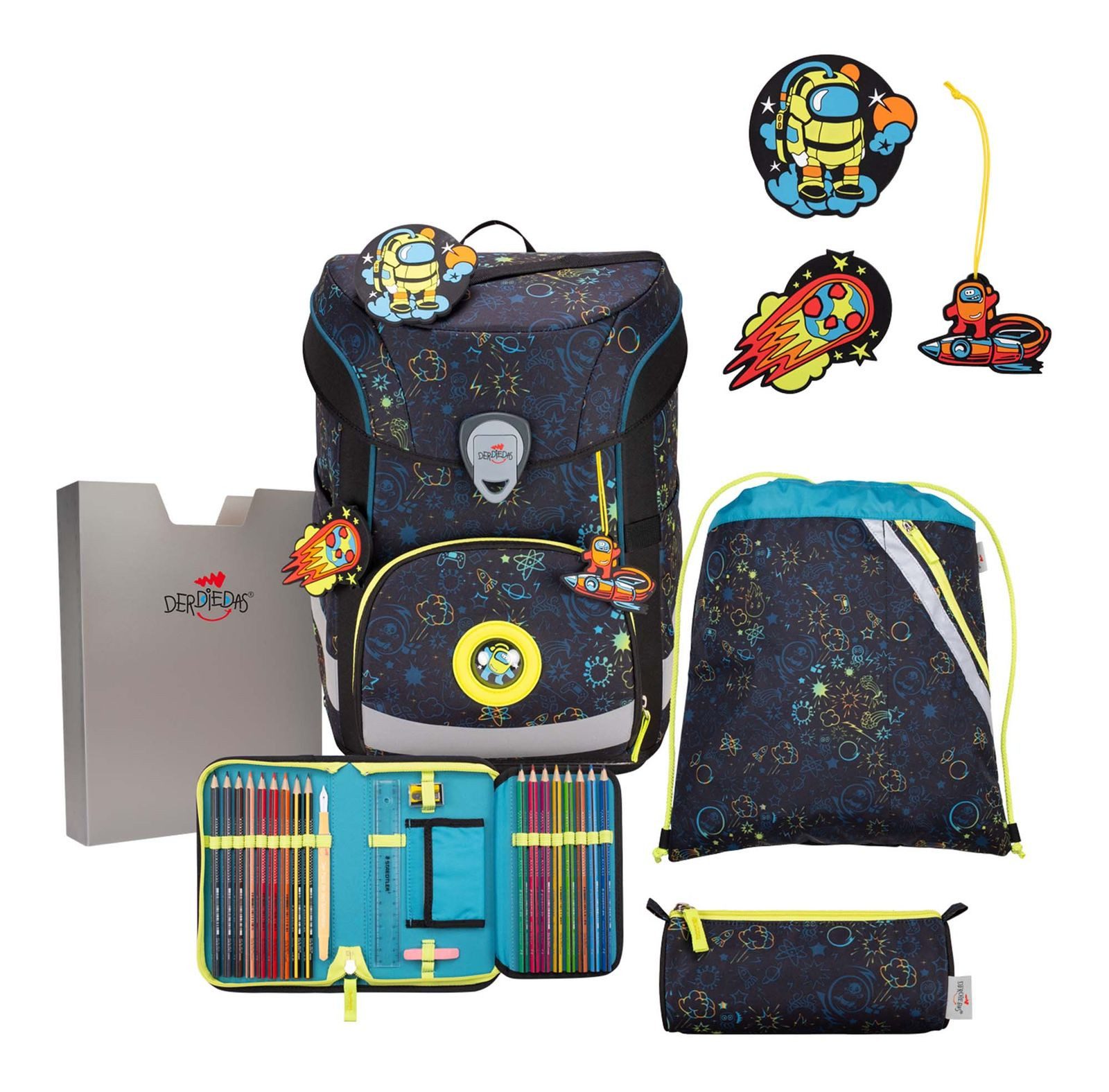 Der ErgoFlex Easy Schulranzen begleitet Kinder sicher und komfortabel durch den Schulalltag. Das leuchtend bunte Design in Blau mit verspielten Einhorn-Details macht den Ranzen zu einem echten Hingucker. * Ergonomisches Tragesystem – höhenverstellbar und mit gepolstertem Beckengurt entlastet es den Rücken und wächst mit dem Kind mit. * Extraheller LED-Ring – sorgt für gute Sichtbarkeit im Dunkeln und erhöht die Sicherheit auf dem Schulweg. * Große reflektierende Flächen – unterstützen die Sichtbarkeit aus allen Richtungen. * Geräumige Fronttasche – bietet Platz für Brotdose und Schüleretui, ergänzt durch zwei Seitentaschen für Trinkflasche und Kleinigkeiten. * Stabiler, wasserabweisender Boden – schützt vor Feuchtigkeit und verlängert die Lebensdauer des Ranzens. * Magnetschloss – einfach zu bedienen und schnell verschließbar, ideal für kleine Hände. Das praktische Komplettset mit Heftebox, Sportbeutel und Mäppchen ist ideal für den Schulstart und verbindet Sicherheit mit kindgerechtem Komfort.