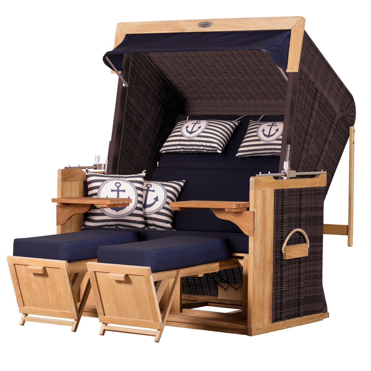Komfort für Ihre Wellness-OaseDie Bezüge des deVries Nordsee-Strandkorbes sind aus Polyester gefertigt und für den Außeneinsatz hervorragend geeignet. Die uni-blaue Polsterung wird gekonnt durch die hellen Kissen mit Anker-Druck in Szene gesetzt. Die ebenfalls blaue Sonnenmarkise wird mit der Teakholz-Zierblende zum Hingucker. Die eingearbeitete Windschutzfolie sorgt auch in den Abendstunden dafür, dass störende Zugluft Ihre Entspannung nicht trübt.