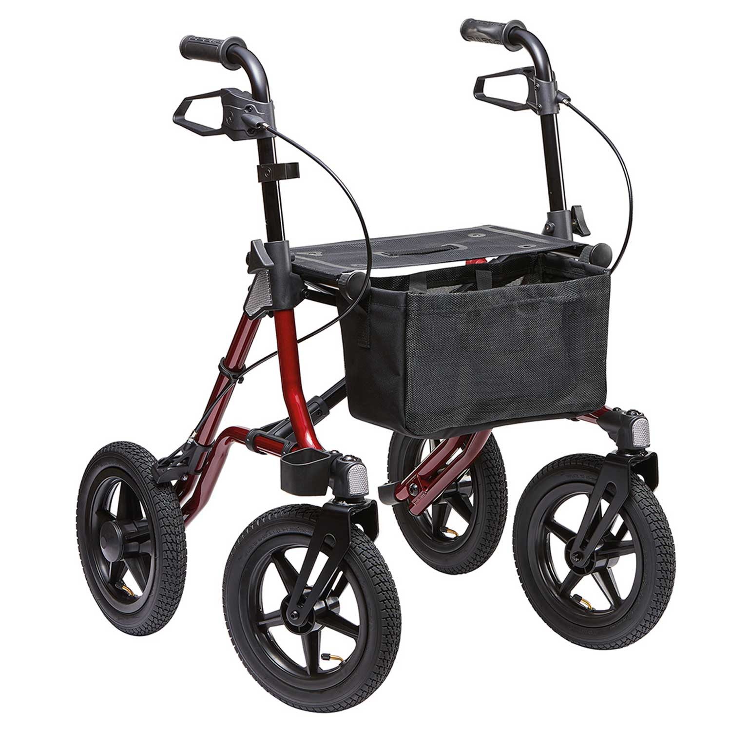 Die großen 12-Zoll-Räder mit Luftbereifung sorgen für ausgezeichneten Fahrkomfort, da sie Erschütterungen auf unebenen Untergründen wie Kopfsteinpflaster, Schotterwegen oder Waldpfaden optimal dämpfen. Dadurch werden Stöße reduziert, was die Gelenke des Nutzers entlastet und für ein angenehmes Fortbewegen sorgt. Die stabile Rahmenkonstruktion aus Aluminium verleiht dem Rollator eine hohe Stabilität und Langlebigkeit.