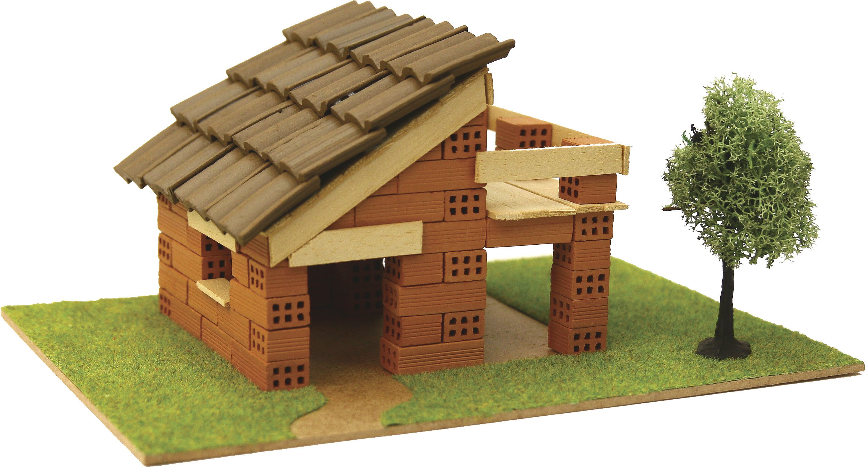 Bauweise und Materialien: Der Aufbau des Modells erfolgt nach dem Vorbild echter Maurerarbeit im Miniaturformat. Zunächst wird ein stabiler Rohbau zusammengesetzt, der als Grundgerüst für das Haus dient:contentReference[oaicite:3]{index=3}. Anschließend werden die 119 echten Ziegelsteine aus gebranntem Ton mit dem beiliegenden, ungiftigen Spezialkleber Stein für Stein aufgebracht, bis Wände und Dach fertiggestellt sind:contentReference[oaicite:4]{index=4}:contentReference[oaicite:5]{index=5}. Durch die Verwendung dieser realen Baumaterialien erhält das fertige Häuschen eine authentische Optik und Haptik:contentReference[oaicite:6]{index=6}. Man spürt regelrecht den Charme eines echten kleinen Hauses. Alle verwendeten Materialien sind selbstverständlich ungiftig und kindgerecht:contentReference[oaicite:7]{index=7}. Die Montage ist dabei für Kinder ab 6 Jahren (mit Unterstützung eines Erwachsenen) leicht zu bewältigen:contentReference[oaicite:8]{index=8}.