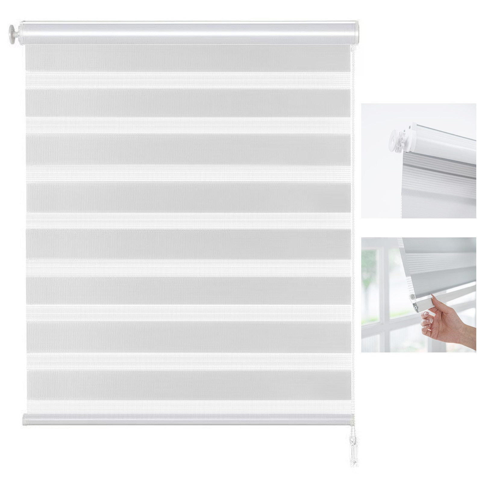 Das Doppelrollo mit Klemmfix ohne Bohren besteht aus abwechselnd halbtransparenten und abdunkelnden Stoffstreifen.
