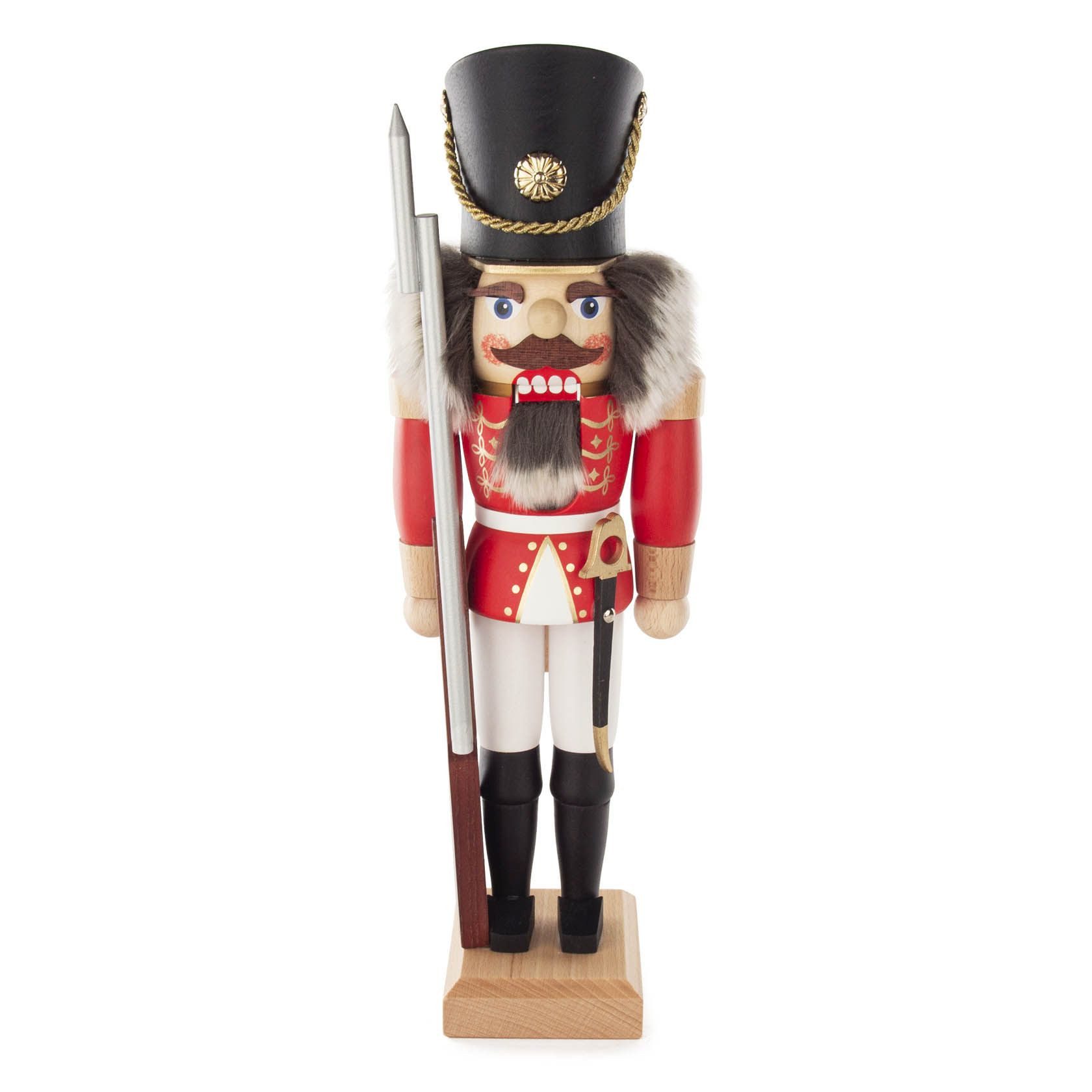 | Nussknacker Soldat Rot lasiert Nussknacker aus Holz die Nüsse mittels Hebeltechnik in ihrem Mund knacken, werden besonders in der Weihnachtszeit als Dekoration aufgestellt. Holen Sie sich einen ganz besonderen Nussknacker. Dieser wird in verschiedenen Arbeitsschritten komplett im Erzgebirge gefertigt. Das oft grimmige Aussehen der Nussknackergesichter soll an die damalige Obrigkeit erinnern. Der Soldat hat eine Höhe von 38 cm, trägt einen Säbel und sein Gewehr. Er trägt eine schwarze Mütze auf dem Kopf, seine rot-weiße Uniform und ist sonst farbig gestaltet. Auf dem Sockel steht der Kerl fest und sicher. Der Bart und die Haare bestehen aus weichem Fell. BxHxT 12x38x10cm NEU |