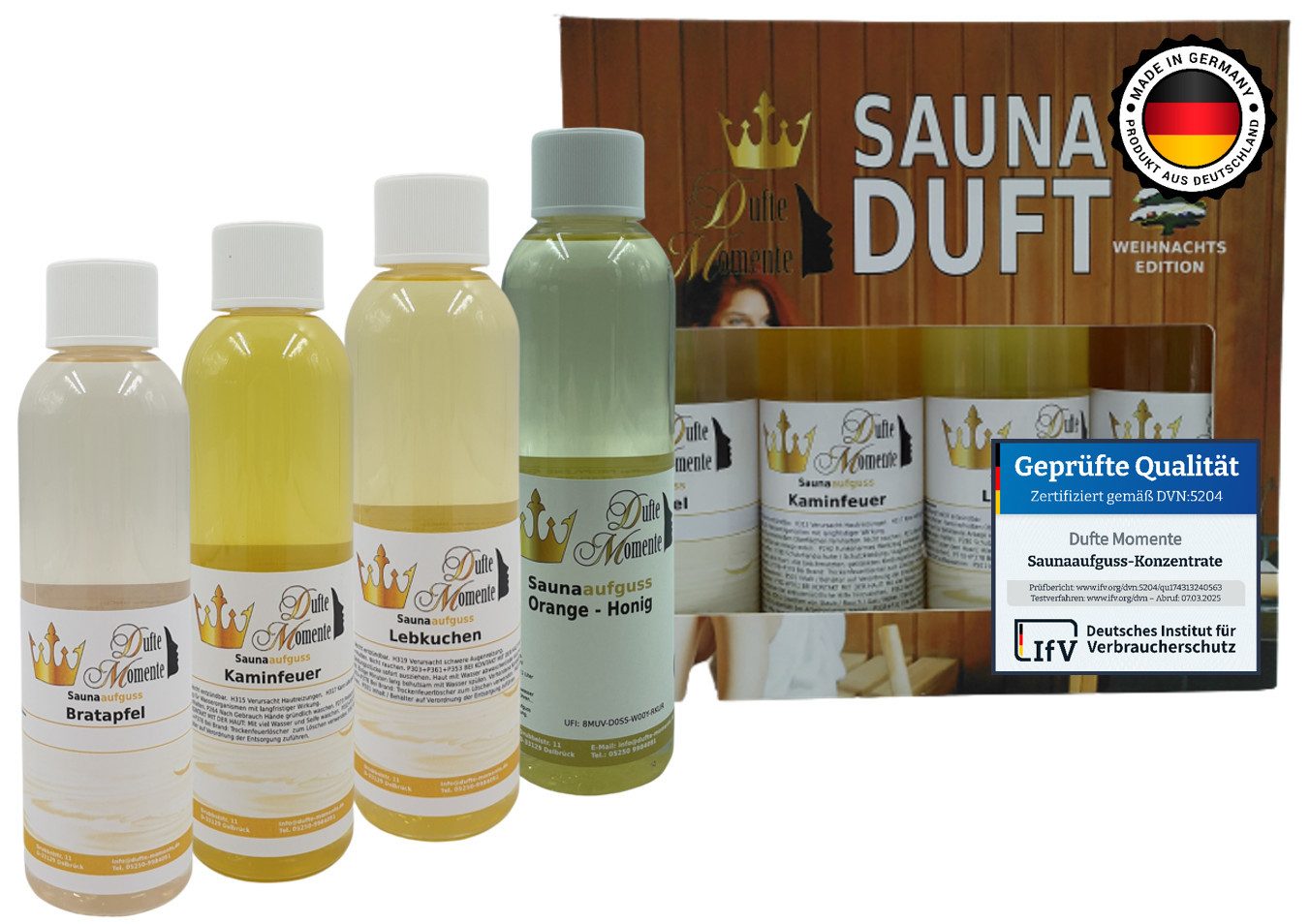 Lieferumfang: 4 Flaschen à 250 ml Saunaaufguss-Konzentrat (Bratapfel, Kaminfeuer, Lebkuchen, Orange-Honig) in Geschenkverpackung / Umverpackung.
