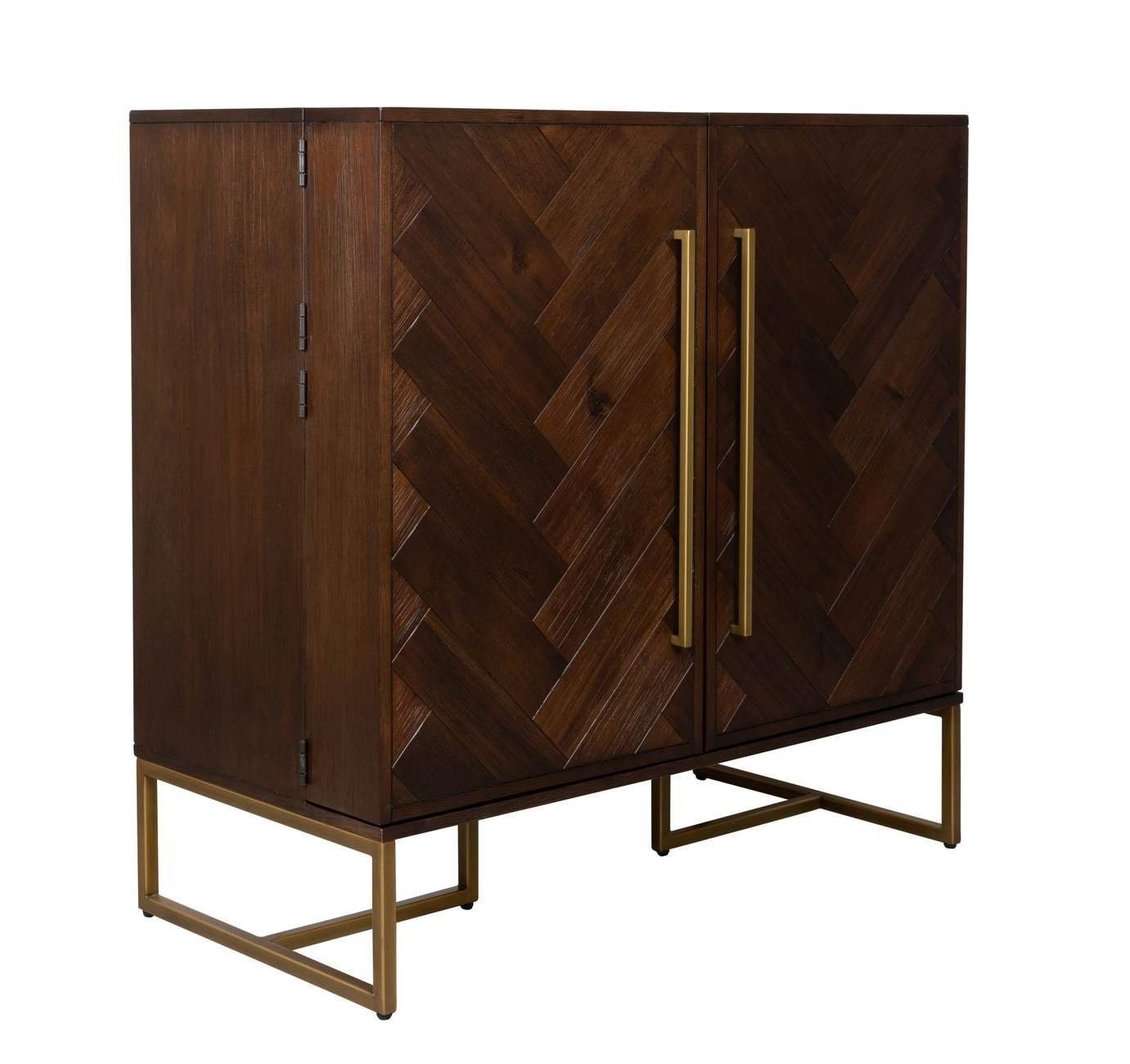 Antik Messing ist aber auch noch als Nostalgiefaktor mit im Spiel, an schönen Details mangelt es aber auch nicht: Ein feines Fischgrätmuster aus Akazie paart sich mit den smarten Griffen aus Metall.