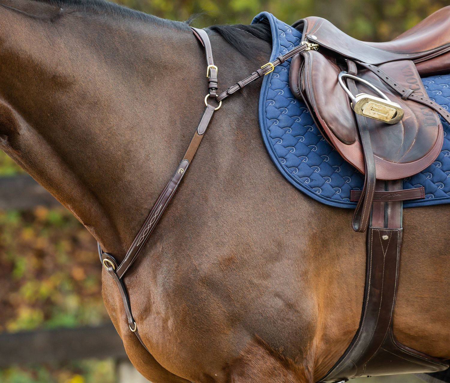 Das Dyon Vorderzeug aus der D-Colllection verfügt über eine verstellbare Brücke. Das leicht kantig-bombiertes Leder setzt sich mit schicken Ziernähten ab. Zwei zusätzliche D-Ringe eignen sich hervorragend zur Anbringung von Ausbindezügeln bzw. Longierhilfen. Um einen hohen Komfort zu gewährleisten, wurden im Vorderzeug 6 cm lange Elastikeinsätze eingearbeitet.