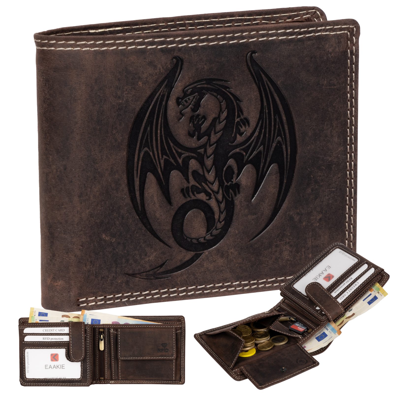 Marke : EAAKIE Motiv : Drache Farbe : Braun Material : Büffelleder Format : Querformat Maße : 9,5 x 12 x 2 cm (H x B x T) Gewicht : ca. 125 Gramm