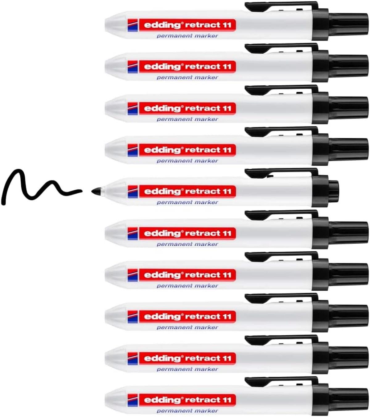 edding retract 11 Permanentmarker - schwarz - 10 Stifte - Rundspitze 1,5-3 mm - wasserfest, schnell-trocknend - für einfache Einhandbedienung - für Karton, Kunststoff, Holz, Metall, Glas