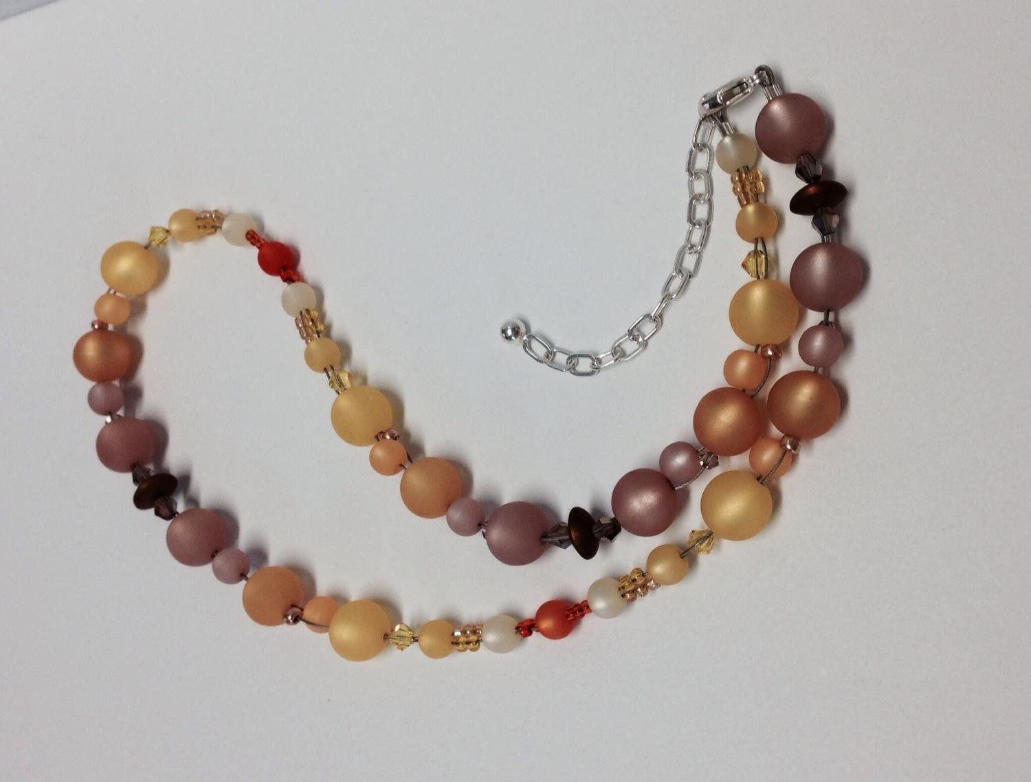 Dies ist eine Acrylperlenkette in verschiedenen Färbungen von Altrosa, über gelb, orange bis hin zu braun. Zu den jeweileigen Farben wurden hier die passenden Kristalle und Glasperlen eingefügt. Diese geben einen interessanten Kontrast zu den seidig matten Acrylkugeln. Abwechslung kommt auch in die Kette durch unterschiedlich große Kugeln. Einen sicheren Halt versichert die Kette durch das reißfeste Stahlseil, auf welches die vielen Elemente gefädelt wurden. Verschlossen wird die Kette mittels einem stabilen Karabiner aus echte 925/- Sterling Silber und einer Verlängerungskette gegenüber liegend. Dadurch ist die Kette flexibel zu Tragen. Gesamtlänge der Kette: 42 cm + 6 cm Gesamtgewicht der Kette: 9,8 g Durchmesser der Acrylkugeln: 10 mm 8 mm 6 mm Durchmesser der Kristalle: 4 mm