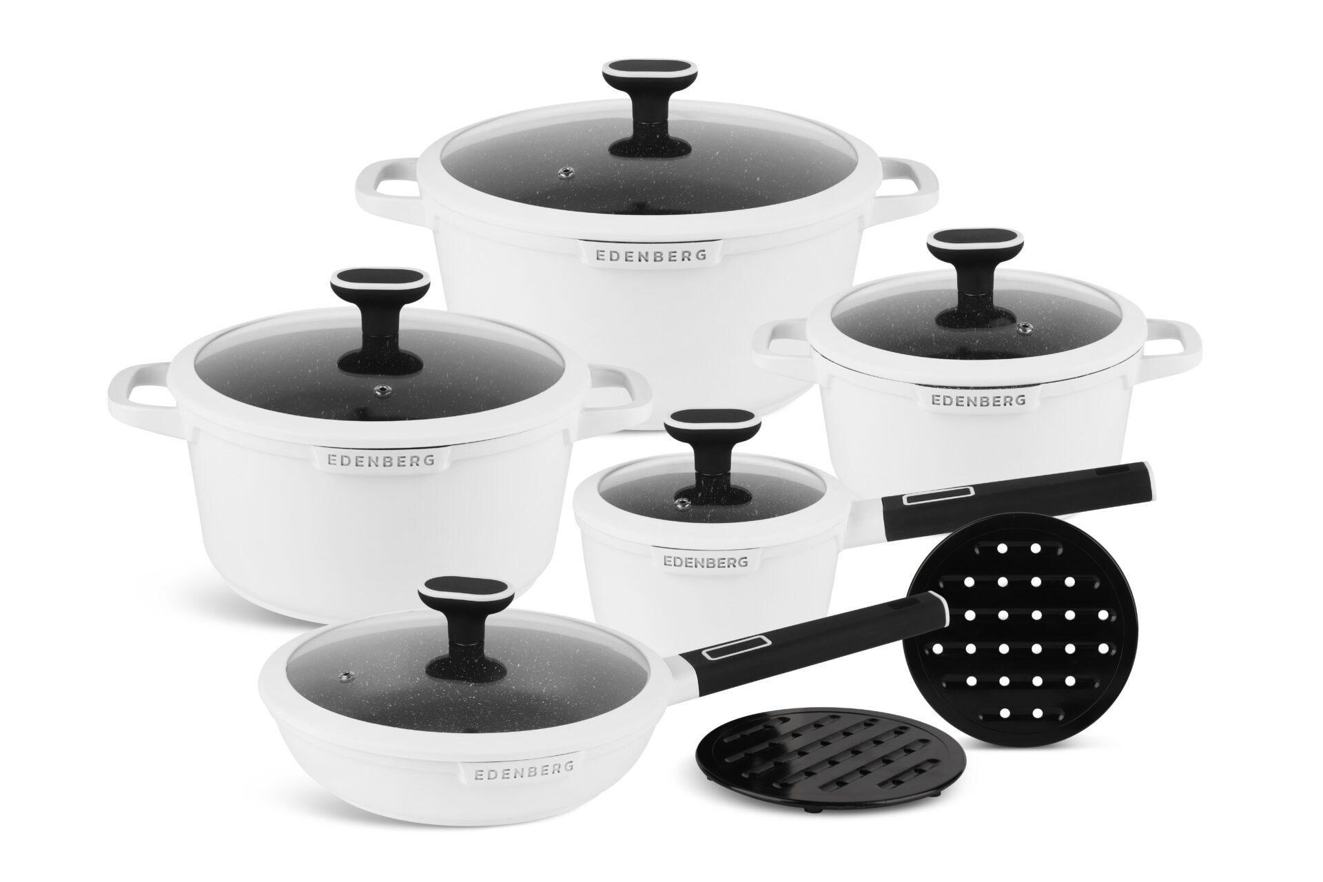 | Eigenschaften | Gefertigt aus hochwertigem, stranggepresstem Aluminium Elegantes, stilvolles Design in schneeweißem Farbton Keramik-Marmor-Beschichtung für hohe Hitzebeständigkeit Zusätzliche Antihaftbeschichtung – kein Anhaften der Speisen Ermöglicht gesundes, fettarmes Kochen Hervorragende Wärmeleitfähigkeit für gleichmäßiges Garen Leichtes Material – komfortables Handling Kratzfest und besonders langlebig Ergonomisch geformte Griffe mit Soft-Touch-Beschichtung Griffe werden beim Kochen nicht heiß Deckel aus gehärtetem Glas mit integriertem Dampfloch Silikonrand an den Deckeln – schließt sauber, verhindert Klappern Leicht zu reinigen und hygienisch Geeignet für alle Herdarten, einschließlich Induktionskochfelder Hochwertige Verarbeitung für langjährige Nutzung Modernes, zeitloses Design für jede Kücheneinrichtung |