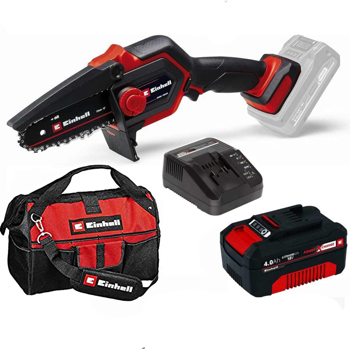 Die Einhell Akku-Astkettensäge GE-PS 18/15 Li BL-Solo ist ein handlicher Helfer für Rück- und Formschnitte von Bäumen und Sträuchern sowie zum Zerkleinern von Grünschnitt und zum Schneiden von kleineren Kanthölzern. Die kompakte Säge ist Mitglied der Einhell Power X-Change Familie und kann mit allen Akkus und Ladegeräten der Systemfamilie kombiniert werden. Angetrieben wird das Gerät von dem Einhell PurePOWER Brushless Motor. Dieser bürstenlose Motor bietet mehr Kraft und eine längere Laufzeit als herkömmliche Kohlebürsten-Motoren. Nach einer Online-Registrierung gelten 10 Jahre Garantie auf den Brushless-Motor. Mit einer Schwertlänge von 15,8 cm und 12,5 cm Schnittlänge eignet sich die kleine und leichte Akku-Astkettensäge optimal zum flexiblen Einsatz im Garten. Der hocheffiziente Motor sorgt für sehr geringe Vibrationen und eine Kettengeschwindigkeit von bis zu 4,8 m/s. Geliefert wird die Säge mit einem hochwertigen Schwert- und Ketten-Set für eine hohe Schnittleistung und beste Arbeitsergebnisse. Zur einfachen Wartung können Schwert und Kette einfach und werkzeuglos gewechselt werden. Zum sicheren und flexiblen Einsatz verfügt die Säge über einen Handschutz und eine klappbare Kettenabdeckung. Angenehm in der Hand liegt das praktische Gartengerät dank des schlanken Griffs, spezieller Softgrip-Flächen und der integrierten Handablagefläche zur beidhändigen Nutzung. Eine Schwertabdeckung wird zur sicheren Lagerung der kleinen Kettensäge mitgeliefert. Ebenfalls im Lieferumfang enthalten sind eine Dosierhilfe zur manuellen Ölung der Kette und ein Innensechskantschlüssel zum Nachspannen der Kette. Dieser wird direkt am Gerät verstaut und ist somit jederzeit griffbereit. Die Lieferung erfolgt mit Akku 2.5 Ah und Ladegerät, Systemkoffer