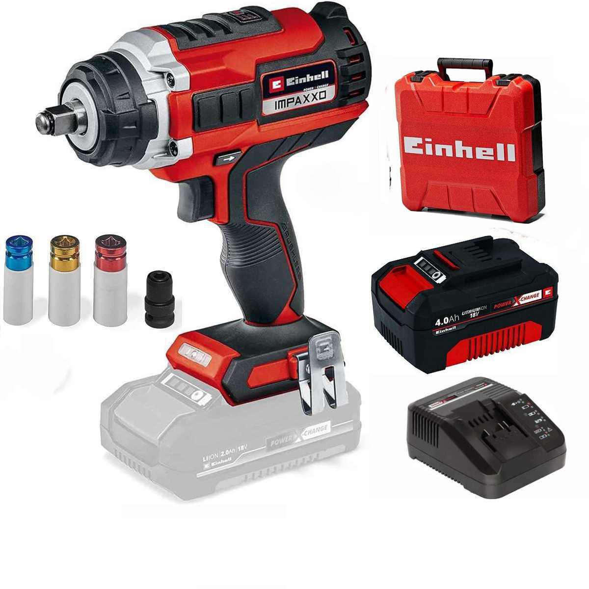 Der Einhell Professional Akku-Schlagschrauber IMPAXXO 18/450 dreht mühelos große oder lange Schrauben ein und schont, im Gegensatz zu Schlagbohrschraubern, im Einsatz die Gelenke des Handwerkers. Als Mitglied der Power X-Change-Familie kann jeder Akku der hochwertigen Systemreihe mit dem Schlagschrauber kombiniert werden. Ein Akku-Schlagschrauber eignet sich für eine Vielfalt an Einsätzen im Haus, der Werkstatt und vor allem in der Garage. Angetrieben wird das Gerät von dem Einhell PurePOWER Brushless Motor. Dieser bürstenlose Motor bietet mehr Kraft und eine längere Laufzeit als herkömmliche Kohlebürsten-Motoren. Nach einer Online-Registrierung gelten 10 Jahre Garantie auf den Brushless-Motor. Das hohe Drehmoment unterstützt das einfache Lösen von Radmuttern. Mittels drei Stufen kann die Drehzahl der Anwendung optimal angepasst werden. Der Akku-Schlagschrauber verfügt über eine robuste 1/2"-Außenvierkant-Aufnahme und über ein LED-Licht zum optimalen Ausleuchten des Arbeitsbereichs. In der Lieferung inklusive ist ein Bit-Adapter zum Schrauben und ein praktisches Nuss-Set für den Autoreifenwechsel.