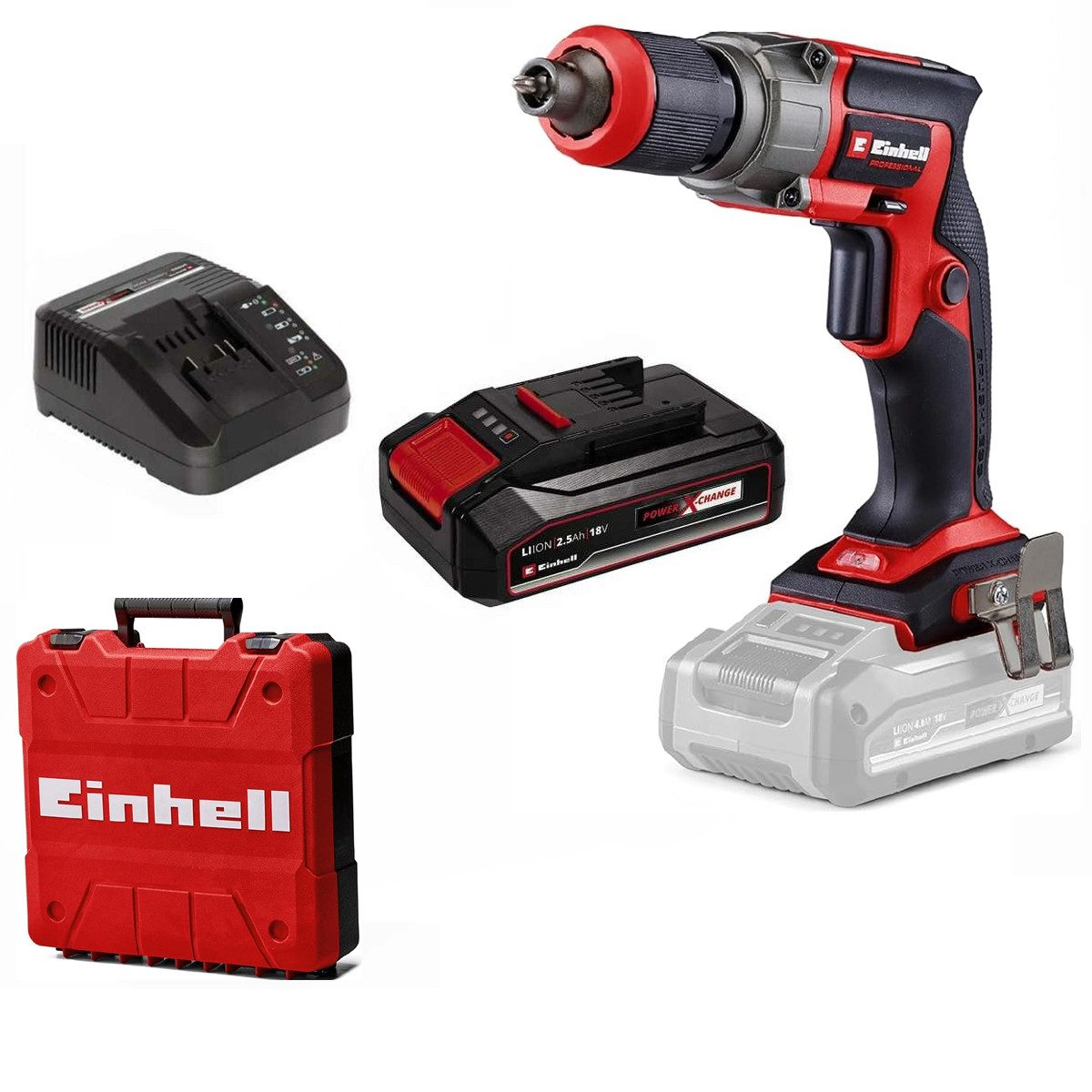 Der Einhell Professional Akku-Trockenbauschrauber TP-DY 18 Li BL - Solo liefert präzise und kraftvolle Leistung bei Renovierungs- und Sanierungsarbeiten ab. Als Mitglied der Power X-Change-Familie lassen sich alle Akkus dieser Systemreihe verwenden und grenzenlos untereinander kombinieren. Angetrieben wird das Gerät von dem Einhell PurePOWER Brushless Motor. Dieser bürstenlose Motor bietet mehr Kraft und eine längere Laufzeit als herkömmliche Kohlebürsten-Motoren. Nach einer Online-Registrierung gelten 10 Jahre Garantie auf den Brushless-Motor. Die exakte Arbeitstiefeneinstellung und -fixierung erfolgt mittels eines justierbaren Tiefenanschlags. Ein ermüdungsarmes Arbeiten wird durch den einstellbaren Dauerbetrieb ermöglicht. Auch die integrierte Druckkupplung erlaubt benutzerfreundliches Schrauben. Dabei sorgt die kurze, leichte Bauweise mit ergonomisch geformten Softgripflächen für einen angenehmen Arbeitsprozess. Dank der LED-Beleuchtung des Akku-Trockenbauschraubers lässt es sich auch in dunklen Bereichen optimal arbeiten. Der Bitwechsel erfolgt schnell und werkzeuglos durch die Magnetbithalterung (6,35 mm/¼"). Zur Ausstattung gehören ein praktischer Gürtelclip, der eine sichere Zwischenlagerung des Akku-Trockenbauschraubers ermöglicht und ein Bit für den sofortigen Projektstart. Geliefert wird der Akku-Trockenbauschrauber in einer praktischen E-Box.