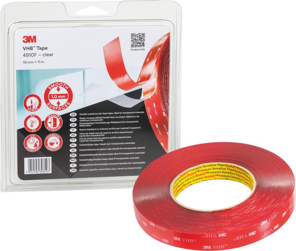 3M™-VHB™ Klebeband 4910F• Hochleistungs Verbindungssystem • Verbindung von hochenergetischen Werkstoffen wie z. B. Metallen, lackierten Oberflächen, lackiertem Holz, Keramik und vielen Kunststoffen • Verbindung von transparenten Werkstoffen wie z. B. Glas, Polycarbonat, Acrylglas (PMMA) • Für Anwendungen, bei denen es auf hochtransparentes Kleben ankommt • Temperaturbeständigkeit +90 °C, kurzzeitig +150 °C
