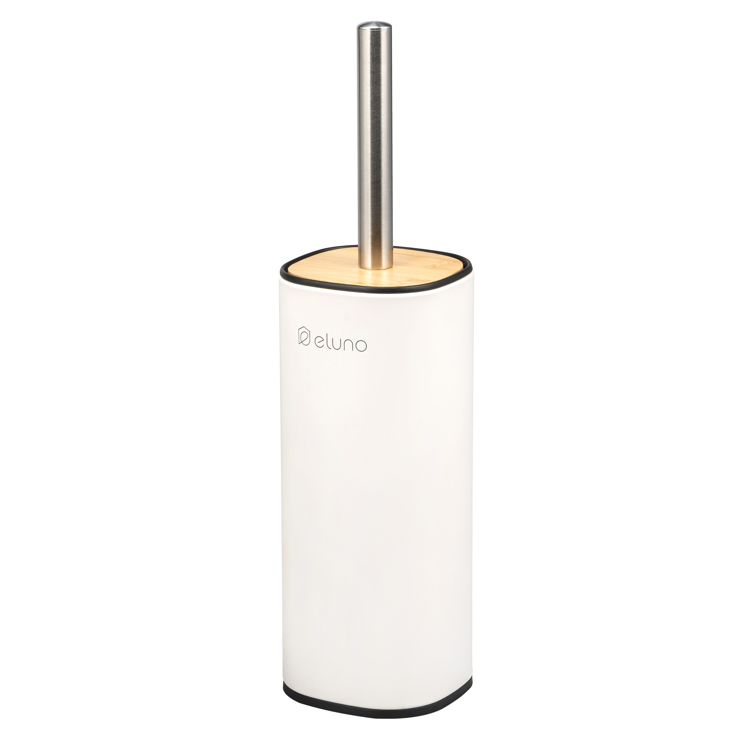 eluno WC-Garnitur FRAMURA mit 2 Bürstenköpfen Die eluno WC-Garnitur FRAMURA verbindet funktionales Design mit natürlicher Ästhetik und ist die ideale Wahl für moderne Badezimmer. Der Toilettenbürstenhalter besteht aus robustem, grauem Metall und wird durch eine stilvolle Abdeckung aus natürlichem Bambus ergänzt - das verleiht Ihrem Bad eine warme und edle Optik. Besonders praktisch: Die Toilettenbürste ist mit einem auswechselbaren Bürstenkopf ausgestattet. So lässt sie sich bei Bedarf schnell und einfach erneuern, was für mehr Hygiene und Langlebigkeit sorgt. Im Lieferumfang sind 2 schwarze Bürstenköpfe enthalten - ideal für eine Auffrischung. Die Bürste ermöglicht eine gründliche Reinigung, während die herausnehmbare Auffangschale im Bürstenhalter eine hygienische Säuberung der gesamten Garnitur unterstützt. Die Kombination aus stilvollem Design und durchdachter Funktionalität macht diese WC-Bürstengarnitur zu einem praktischen und zugleich dekorativen Accessoire in Ihrem Bad. In Kombination mit dem passenden Kosmetikeimer der Serie FRAMURA entsteht ein stimmiges Gesamtbild, das Ihre Badezimmereinrichtung stilvoll abrundet. Die Vorteile auf einem Blick * auswechselbarer Bürstenkopf * inkl. 2x schwarzen Bürstenköpfen * Abdeckung aus Bambus * herausnehmbare Auffangschale * ästhetisch und funktional * passend zum Kosmetikeimer der Serie FRAMURA * Material: aus Metall, rostfreiem Edelstahl und Bambus * Abmessungen ca. 9,5 x 37,5 x 9,5 cm (B/H/T) Lieferumfang 1x WC-Garnitur FRAMURA