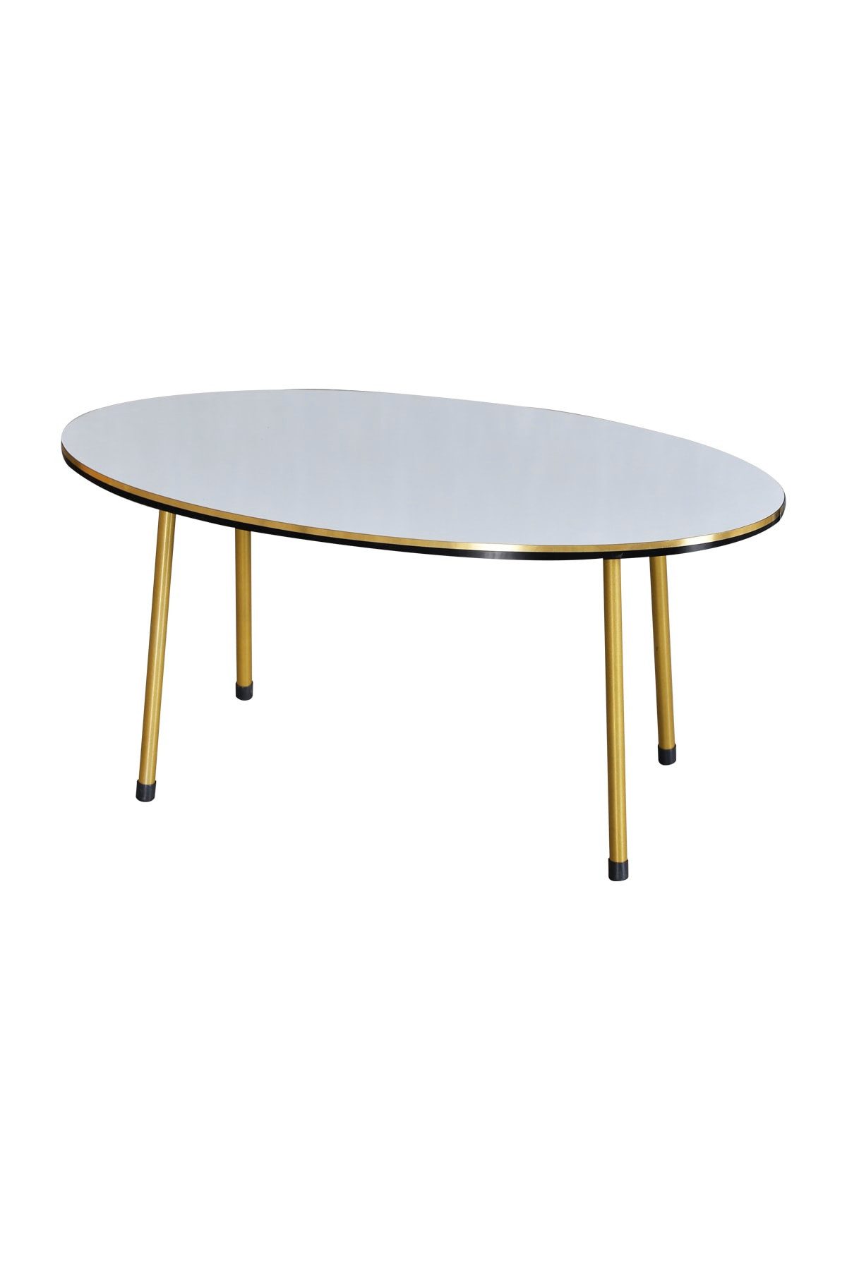 Dieser ovale Couchtisch ist für den täglichen Einsatz im Wohnzimmer gedacht. Er hat eine weiße Platte mit schwarz-goldener PVC-Kante und stabile Metallbeine. Die kompakte Größe passt gut in kleine bis mittelgroße Räume und der Tisch lässt sich leicht selbst montieren.