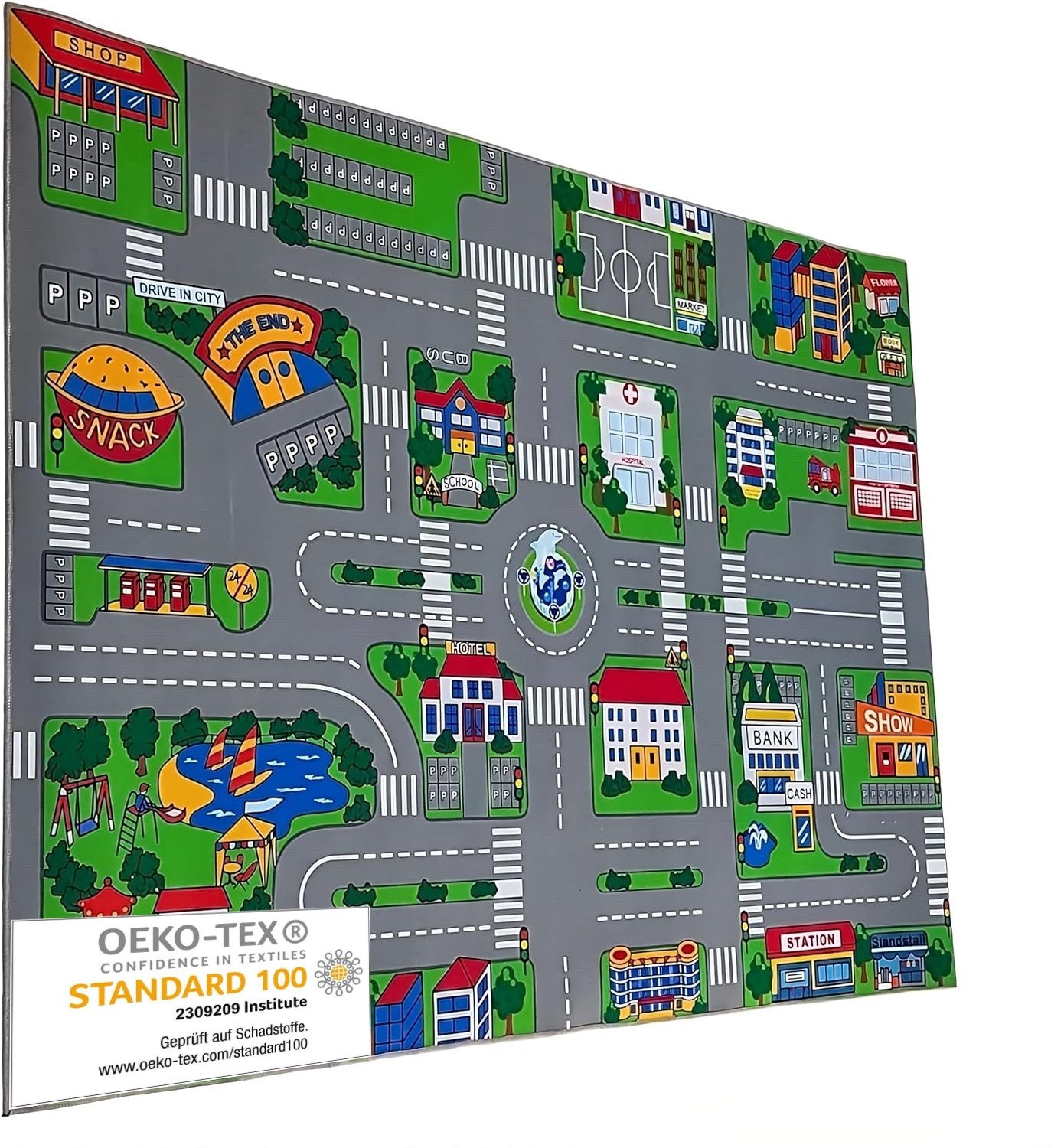 Vielseitiger Spieleteppich: Mit integriertem Freizeitpark, Schule, Geschäften und mehr – perfekt für jedes Kinderzimmer.